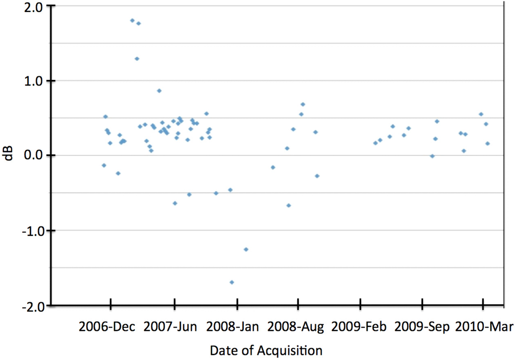 To examine this phenomenon more fully, 70 ScanSAR image strips were analyzed from UTM grid-zone tile 19 M in South America. For each pixel in the tile, the mean and standard deviation of the radiometrically corrected backscatter values were calculated, as well as the ratio of the standard deviation to the mean. If this ratio was less than 0.3 (which we found by observation typically indicated that the pixel was not predominately open water or occasionally inundated vegetation), the mean difference between the mean value and the individual value was determined. For these 70 ScanSAR image strips within tile 19 M, millions of pixels satisfied this criterion. The average mean-difference for each ScanSAR image strip was then calculated and plotted as a function of acquisition date (Figure 2).