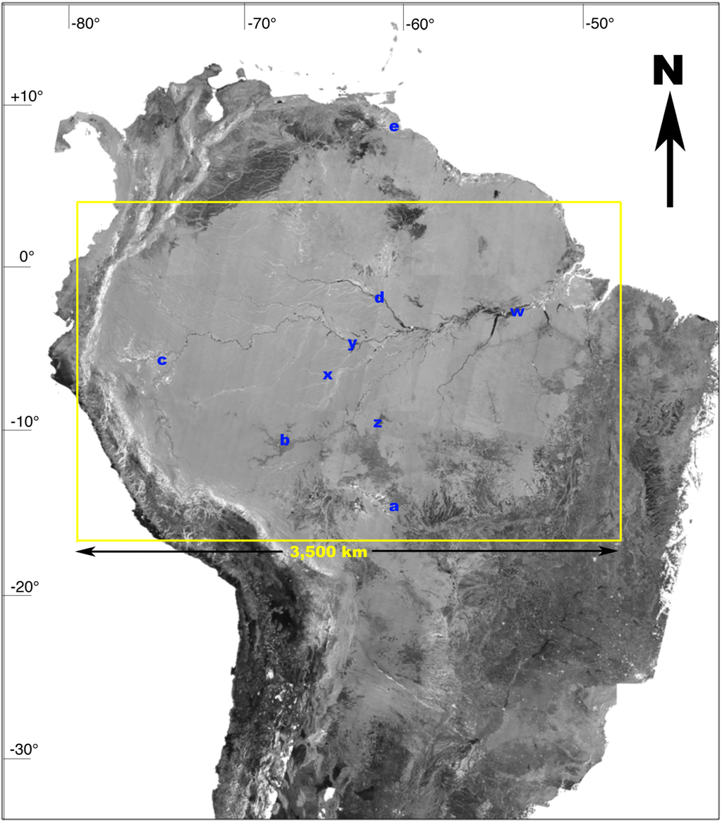 Orthorectified ScanSAR mosaic of most of South America, late-2006 to mid-2010. Colored letters correspond to details shown in subsequent figures. © JAXA,METI.