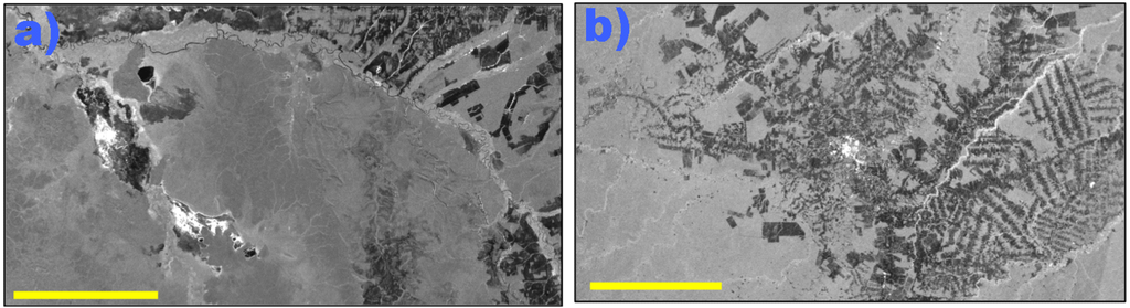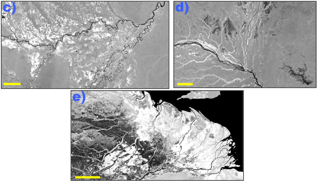 The flooding dynamics of the wetland areas be can difficult to study by traditional optical remote sensing techniques due to frequent cloud cover and the difficulty of detecting sub-canopy inundation [,]. One alternative approach is to use a suite of complementary satellite measurements to estimate factional extent of inundation at a coarse scale []; however, these data sets necessitate the masking of non-wetland areas and could have difficulty detecting inundated areas under the dense forest canopies in tropical regions []. One recent technique consists of using very coarse resolution gravity data from the National Aeronautics and Space Administration (NASA) Gravity Recovery and Climate Experiment (GRACE) mission in combination with satellite altimetry data and other sources of data to estimate the volume of water filling and draining from large wetlands [,]. Perhaps, the best results for the detection of inundated vegetation and open water at fine resolution scales and on large regional scales (though not yet global) have been obtained through the use of Synthetic Aperture Radar (SAR) polarimetric backscatter data (e.g., [,,,,,,]). An important feature of SAR is that cloud cover is irrelevant to the detection of inundation, and SAR technology therefore allows for a detailed examination of the seasonal dynamics of the flooding extent at resolutions better than 100 m.