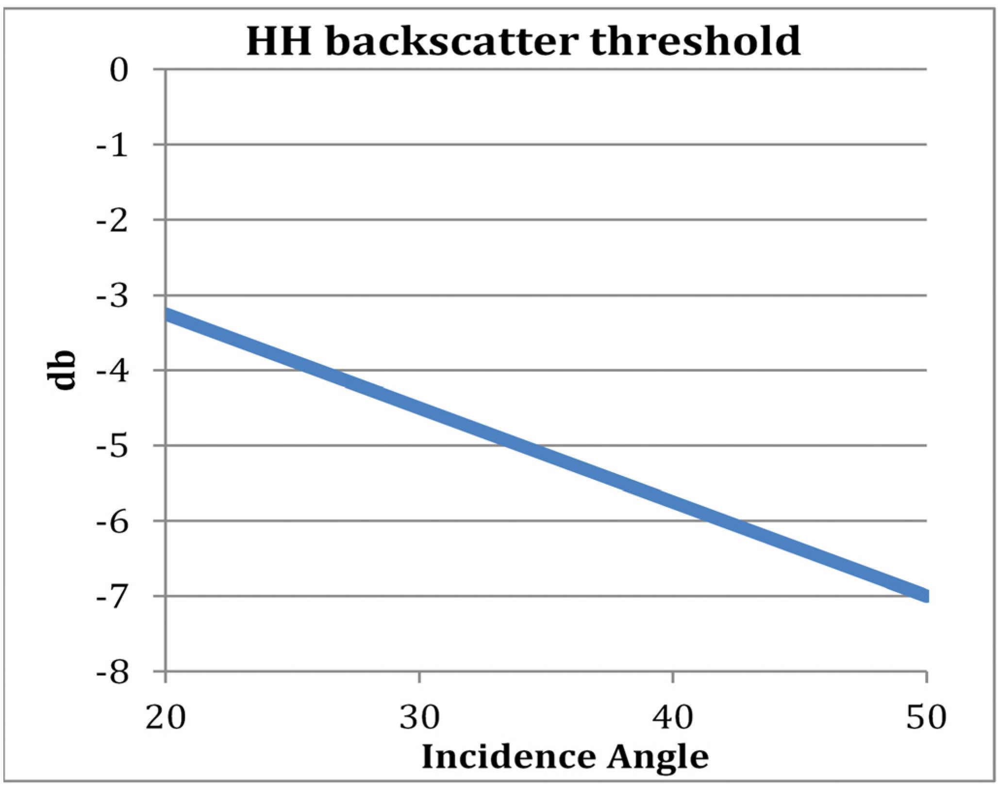 HH backscatter threshold versus incidence angle for the detection of inundation, derived empirically such that similar classifications were obtained in the near and far range of overlapping images acquired five days apart.
