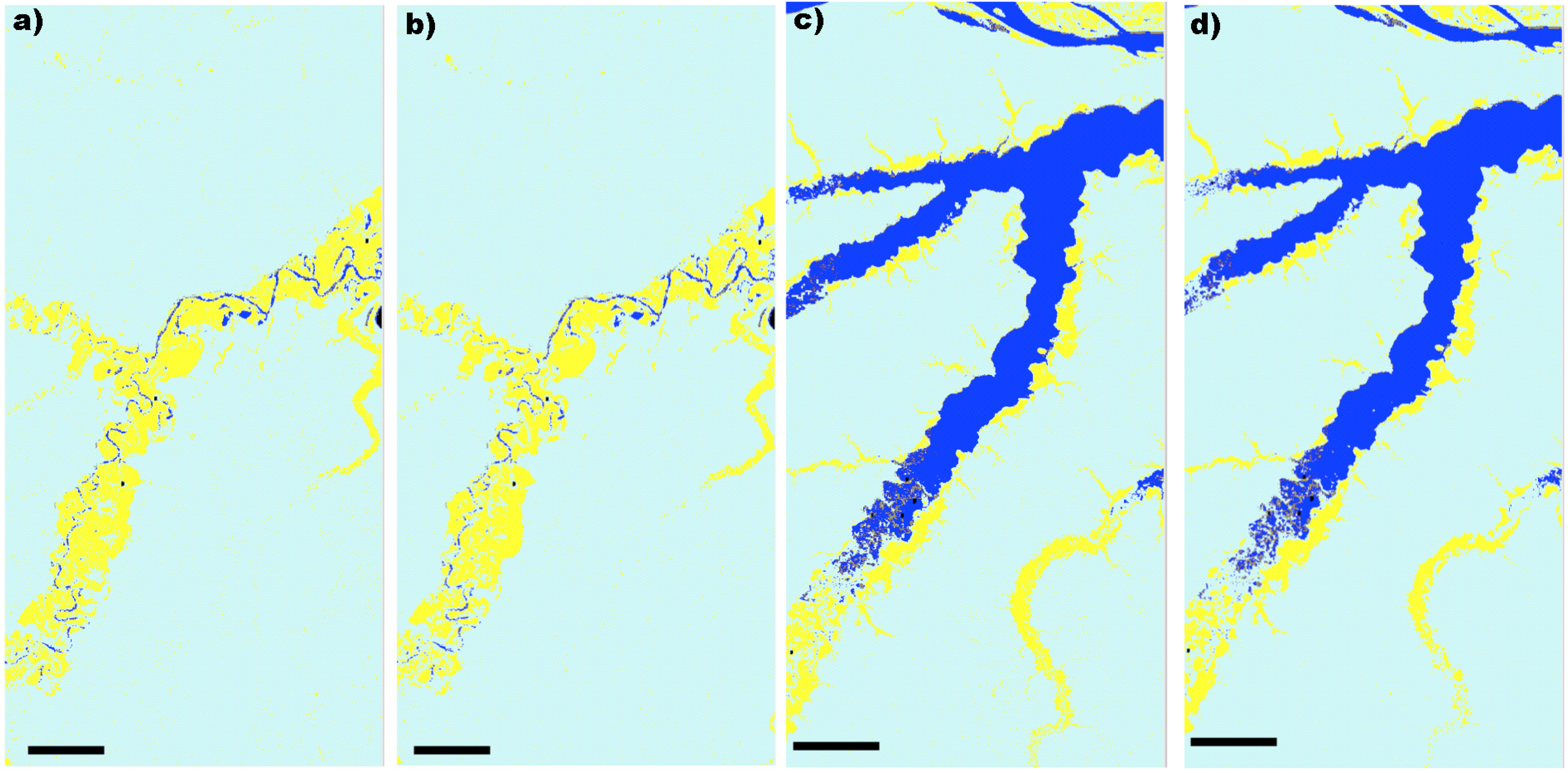 Black bar indicates 10 km scale. (a) Mid-swath classification from 27 June 2007 (coordinate: −5.98°, −64.83° shown by “x” in Figure 3); (b) near-swath classification from 22 June 2007; (c) mid-swath classification from June 27, 2007 (coordinate −4.13°, −63.42° shown by “y” in Figure 3); (d) far-swath classification from 22 June 2007. Yellow indicates inundated vegetation and dark blue indicates open water. All other areas are unclassified.