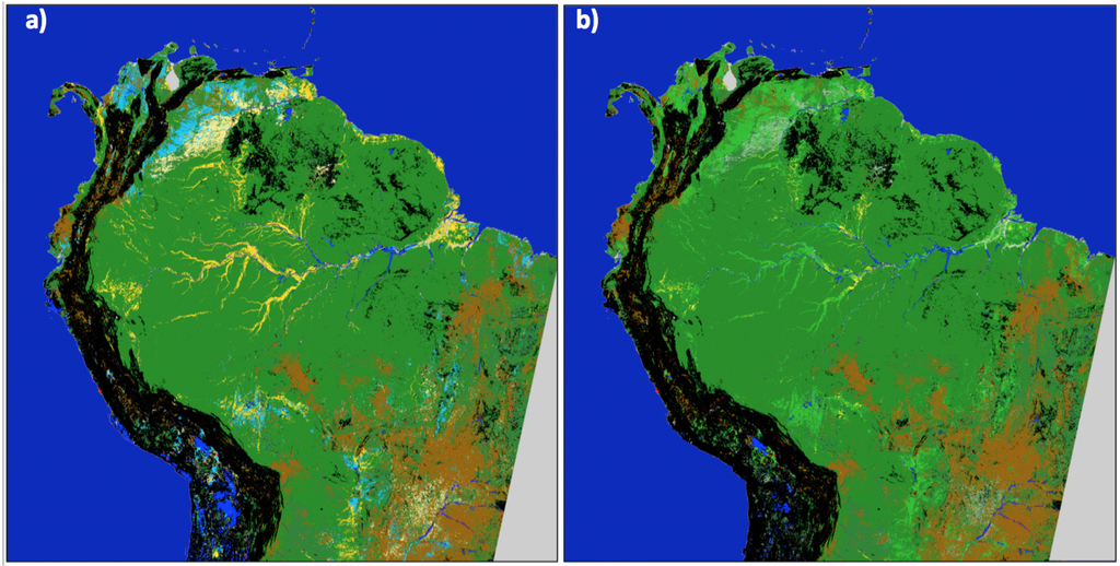 The lakes, rivers, and wetlands of the lowland Amazon Basin span at least 800,000 square kilometers [,]. Each year the runoff from heavy seasonal rains causes extensive and prolonged flooding of vegetated environments. These seasonally, semi-permanently or permanently inundated areas, in addition to forming biologically diverse habitats, also regulate biogeochemical processes such as the generation of methane and the outgassing of CO2 [,,,]. The flooding dynamics will also be impacted by any future changes in rainfall and evapotranspiration; some global circulation models predict that annual rainfall rates in the Amazon Basin could decrease substantially in the next several decades (e.g., [,]). The ability to accurately monitor changes in inundation extent, including uncertainties and possible biases, would support the study of possible climatological tipping points in regions where extensive inundation is prevalent [].