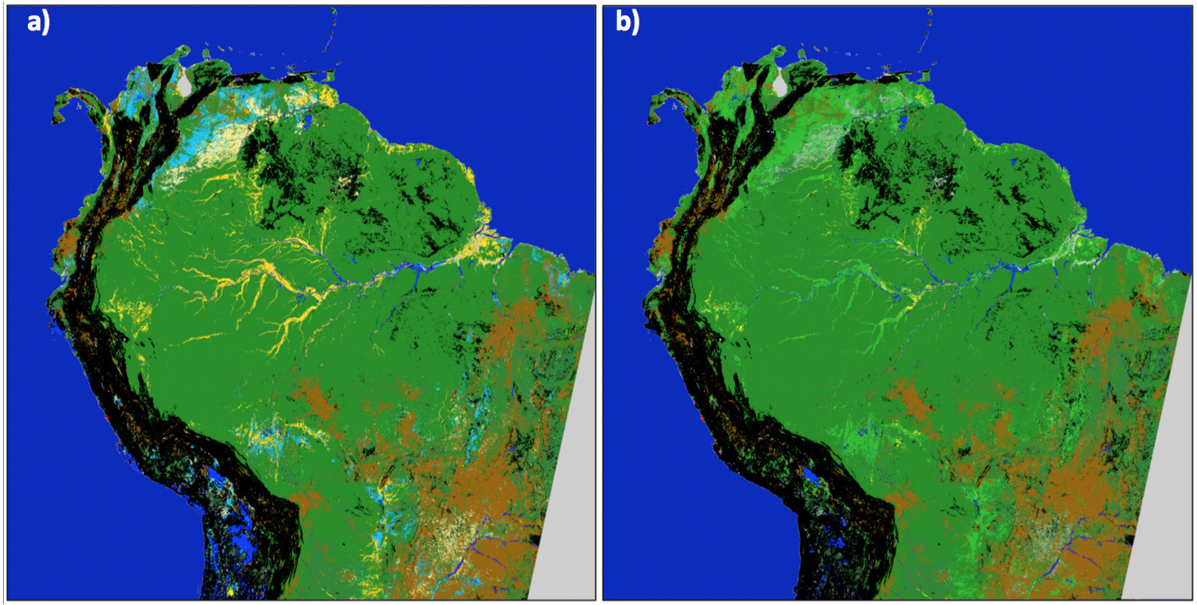 The lakes, rivers, and wetlands of the lowland Amazon Basin span at least 800,000 square kilometers [1,4]. Each year the runoff from heavy seasonal rains causes extensive and prolonged flooding of vegetated environments. These seasonally, semi-permanently or permanently inundated areas, in addition to forming biologically diverse habitats, also regulate biogeochemical processes such as the generation of methane and the outgassing of CO2 [2,3,4,5]. The flooding dynamics will also be impacted by any future changes in rainfall and evapotranspiration; some global circulation models predict that annual rainfall rates in the Amazon Basin could decrease substantially in the next several decades (e.g., [6,7]). The ability to accurately monitor changes in inundation extent, including uncertainties and possible biases, would support the study of possible climatological tipping points in regions where extensive inundation is prevalent [8].