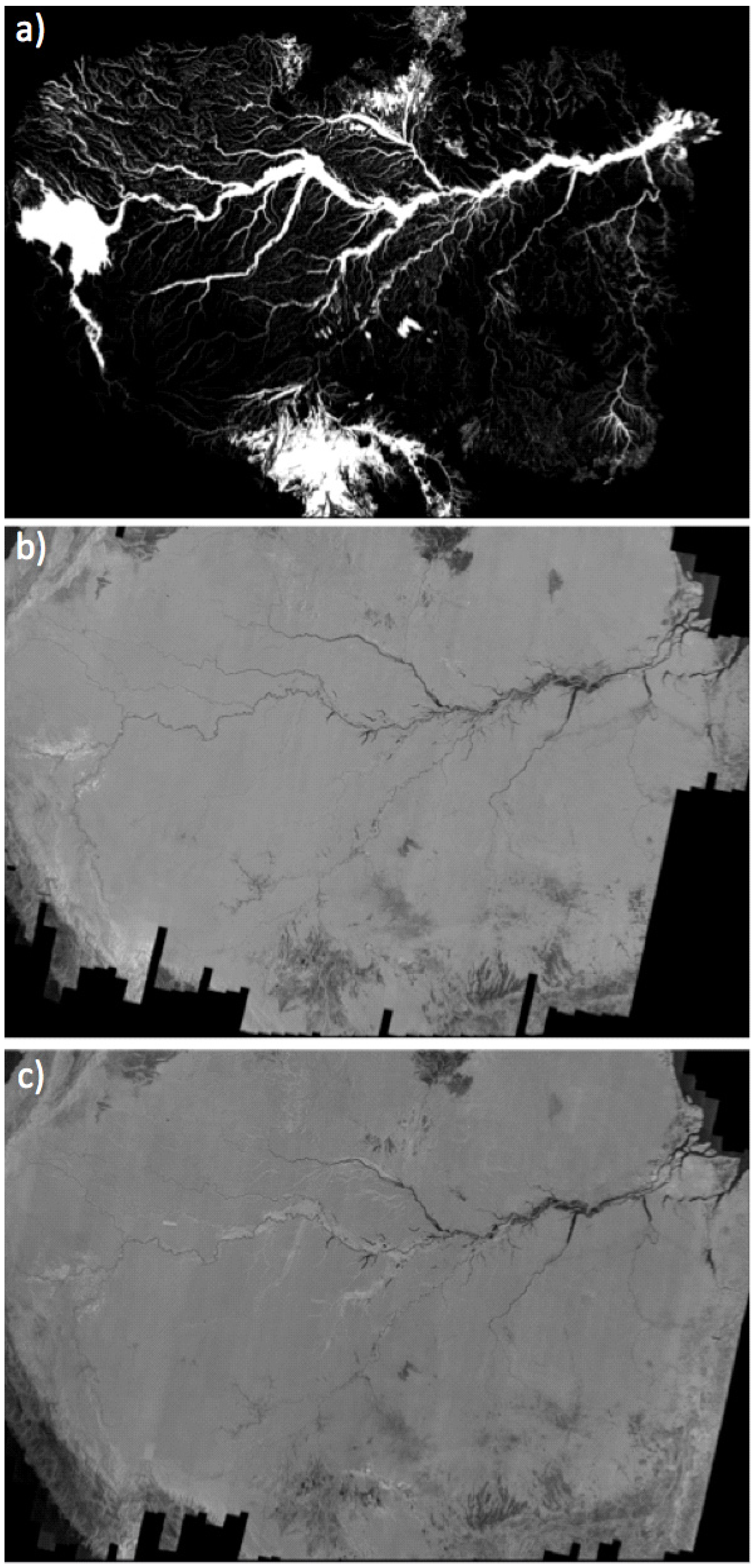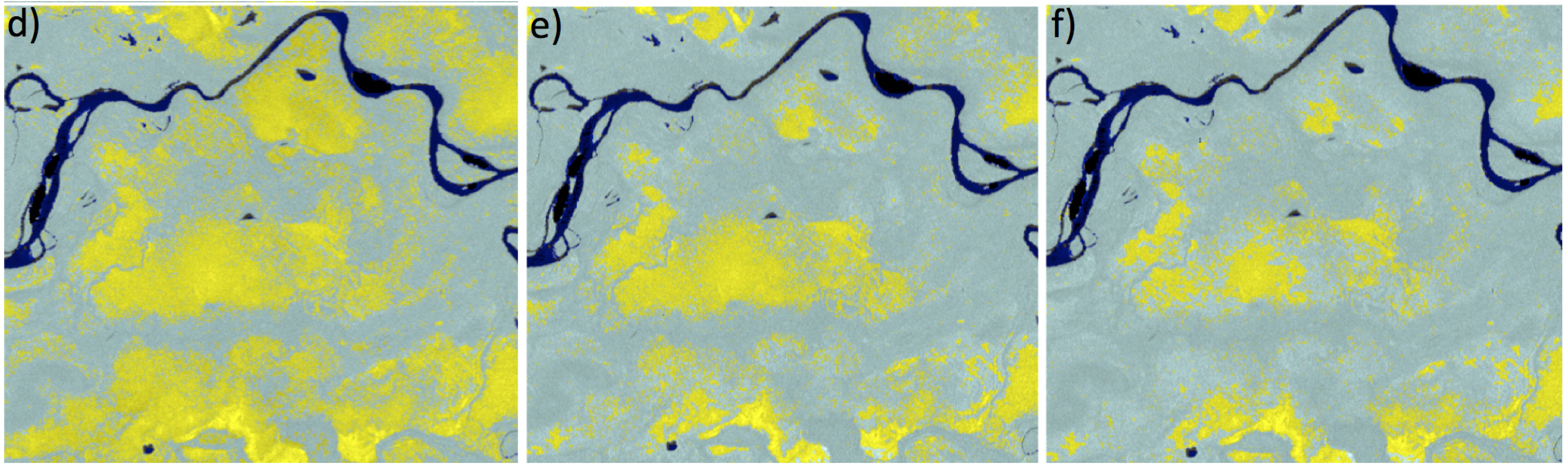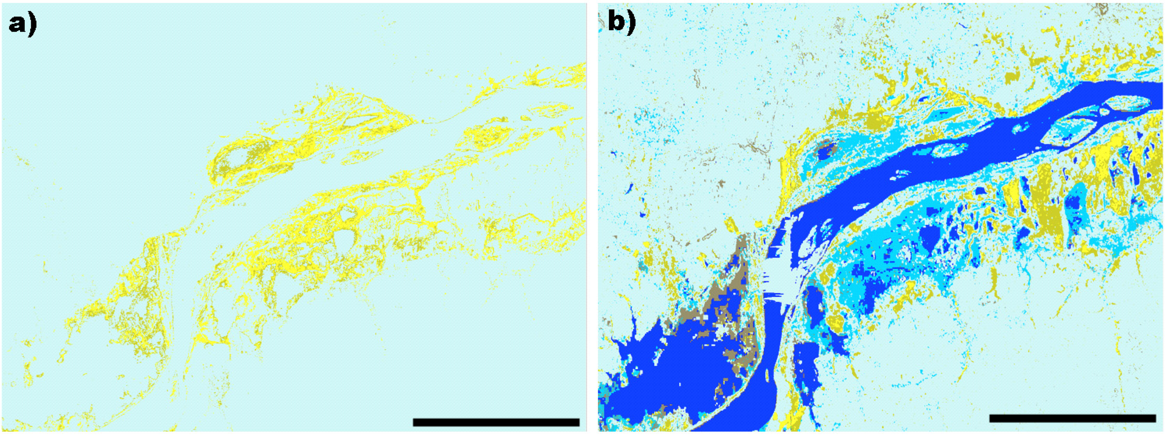 Figure 7 shows the resulting maximum and minimum inundation classification for those areas for which we had ALOS ScanSAR multi-temporal image coverage. Given we used a 3 × 3 spatial averaging filter to remove speckle noise from the individual ScanSAR image values, we estimate our classification of minimum inundation (Figure 7b) was sensitive to inundation occurring at 1–10 hectare scales.