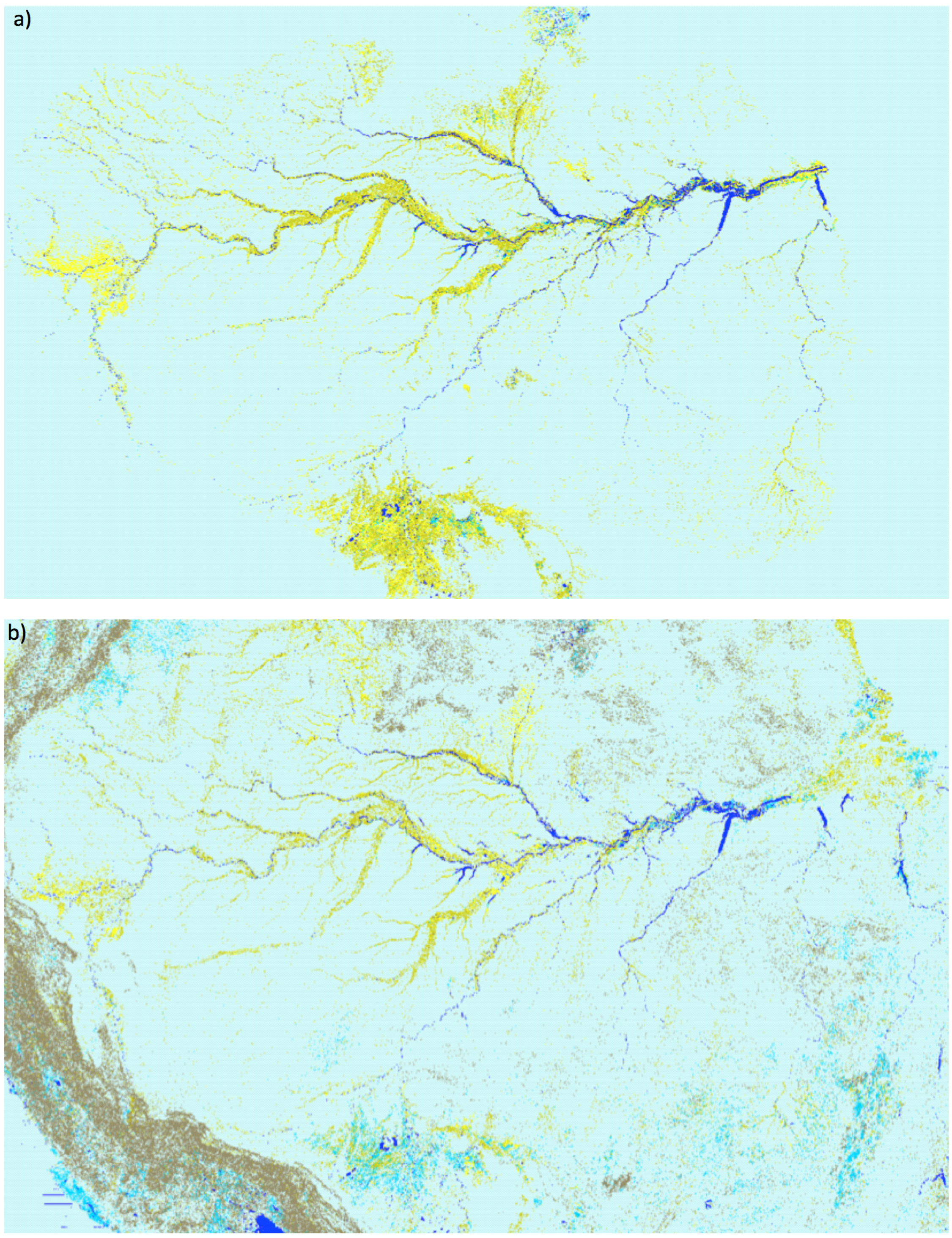 Inundation classification late-2006 to mid-2010; same location as shown in Figure 3. (a) maximum inundation, (b) minimum inundation. Black-topographically excluded; dark blue: open water; light blue: open water maximum; green: not inundated; yellow: inundated vegetation; light yellow: inundated vegetation maximum; brown: croplands from GlobCover 2009; grey: unclassified.