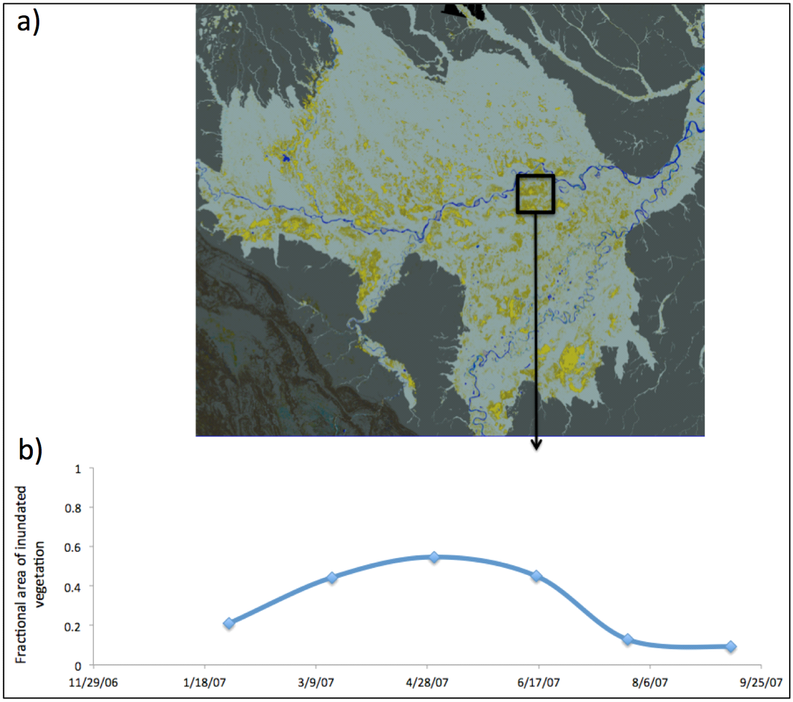 We also examined the fractional area of inundation for a large site (2000 km2) within the Pacaya-Samiria Reserve for six dates in 2007 (Figure 12b). The inundation duration was broad for this area, with maximum inundation occurring late April or early May 2007. The dry season occurred roughly between June and September, where its lowest water levels were 10 m or more below those of the peak water levels. The inundation fraction within the indicated box in Figure 12 ranged from 0.6 (late April) to 0.1 (end of September) during this time period. Figure 13 shows the progression of inundation for this for the six observation dates.