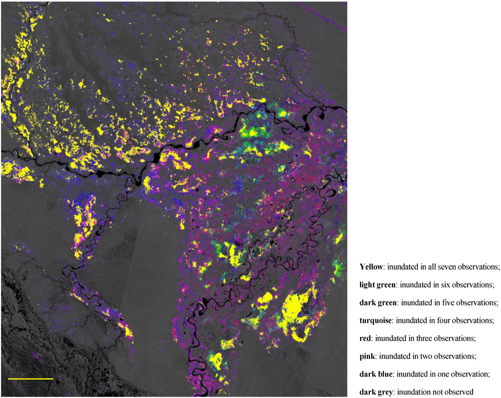 Inundation duration (for vegetated areas) estimated from seven images acquired between 2007 and 2008 from a single orbit path for the Pacaya-Samiria Reserve (area “c” in Figure 3) and surrounding areas in Peruvian Amazon. The area shown spans 300 km from east to west and 350 km from north to south. The yellow bar shows 50 km scale. Background is low contrast multi-temporal image mosaic.