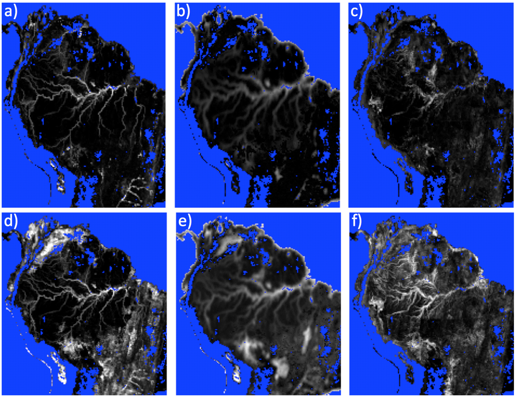 Comparison of inundation and coarse-resolution surface water fraction products for the same area shown in Figure 3. (a) Minimum fraction of open water from ALOS ScanSAR classification; (b) minimum fractional surface water area from coarse resolution sensors; (c) minimum fraction of inundated vegetation from ALOS ScanSAR classification; (d) maximum fraction of open water from ALOS ScanSAR classification; (e) maximum fractional surface water area from coarse resolution sensors; (f) maximum fraction of inundated vegetation from ALOS ScanSAR classification. Blue indicates masked pixels; grey scale indicates relative fractional inundation with white indicating maximum surface water fraction and black indicating no inundation.