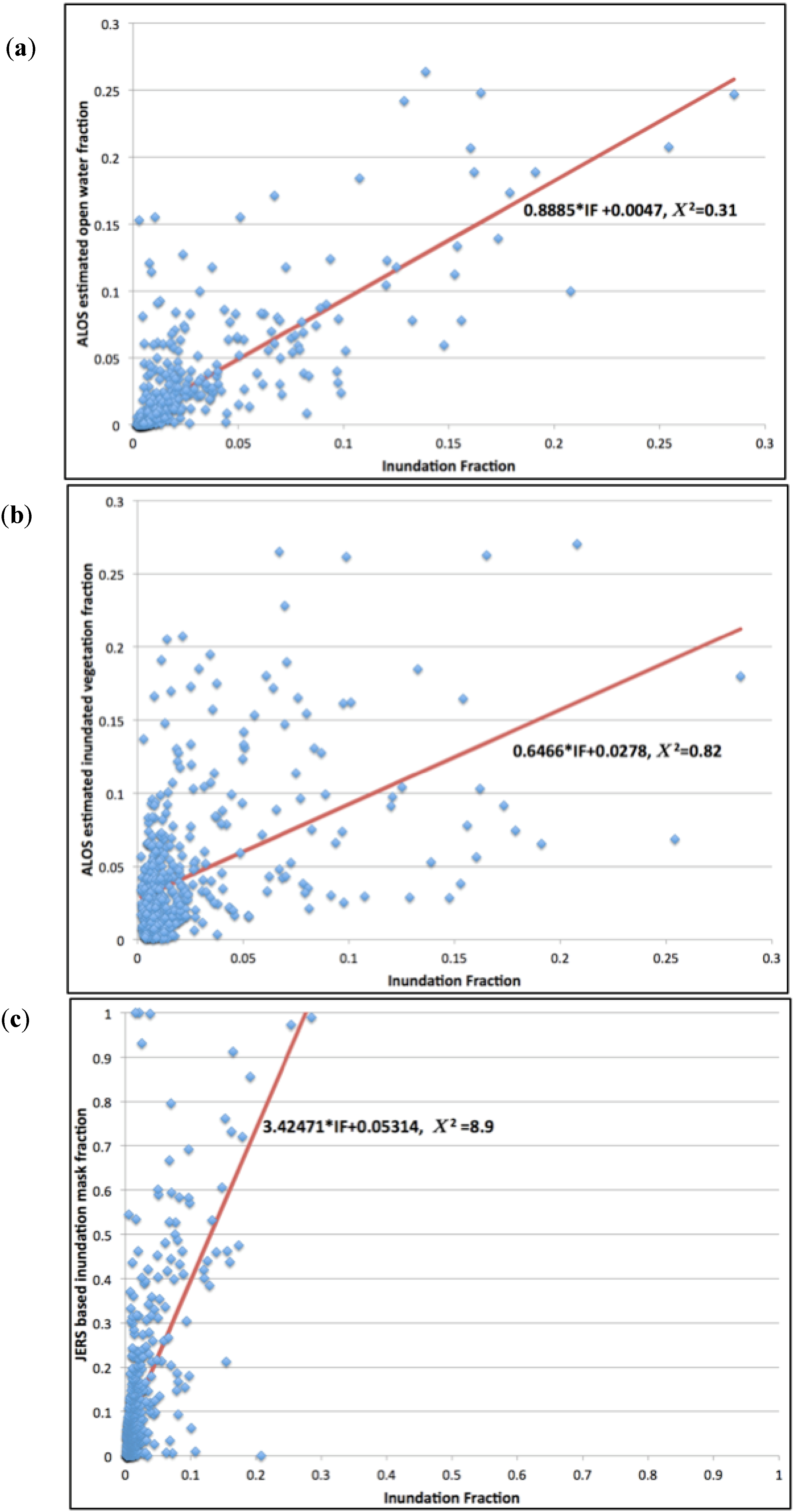Comparison of ALOS and JERS-1 products with coarse-resolution surface water fraction. (a) ALOS open water fraction; (b) ALOS inundated vegetation fraction; (c) JERS-1-based mask (where there is overlap) versus the coarse resolution surface water fraction. Note that the scale of (c) is much larger. Only the ALOS open water fraction has a significant relation to the coarse resolution surface water fraction estimates.