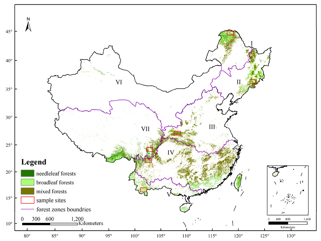 Precipitation decreases from the coast to the inland areas. Three vegetation regions, namely forests, steppes, and deserts, correspond to moist, semi-arid, and arid climates, respectively [50]. According to Chinese vegetation geography [49,51] and geographic characteristics of forests, Chinese forests have been divided into five forest zones (Figure 1): Cold temperate zone (I), which is dominated by deciduous needleleaf forests; temperate zone (II), which is characterized by deciduous mixed broadleaf-needleleaf forests; warm temperate zone (III), including China’s largest plain, with secondary broadleaved-mixed forests and intensive agricultural activity; subtropical zone (IV), with large formations of evergreen broadleaf forests (the western region of the subtropical zone is dominated by high mountains and affected by the southwest monsoon, while the eastern region is dominated by hills and affected by the southeast monsoon); tropical zone (V), whose annual average temperature is over 22 °C and average annual precipitation is above 1500 mm. Two other vegetation zones (not dominated by forests) were also used in this study (Figure 1): The Neimeng-Xinjiang arid zone (VI), which is distinguished by Picea and Larix in the Tianshan, Altai, and Qilian Mountain regions (most land areas in this zone are covered by steppes and deserts due to a continental climate with severe annual variations in temperature); and the Qinghai-Xizang plateau alpine zone (VII), which retains the largest area of virgin forest in China.
