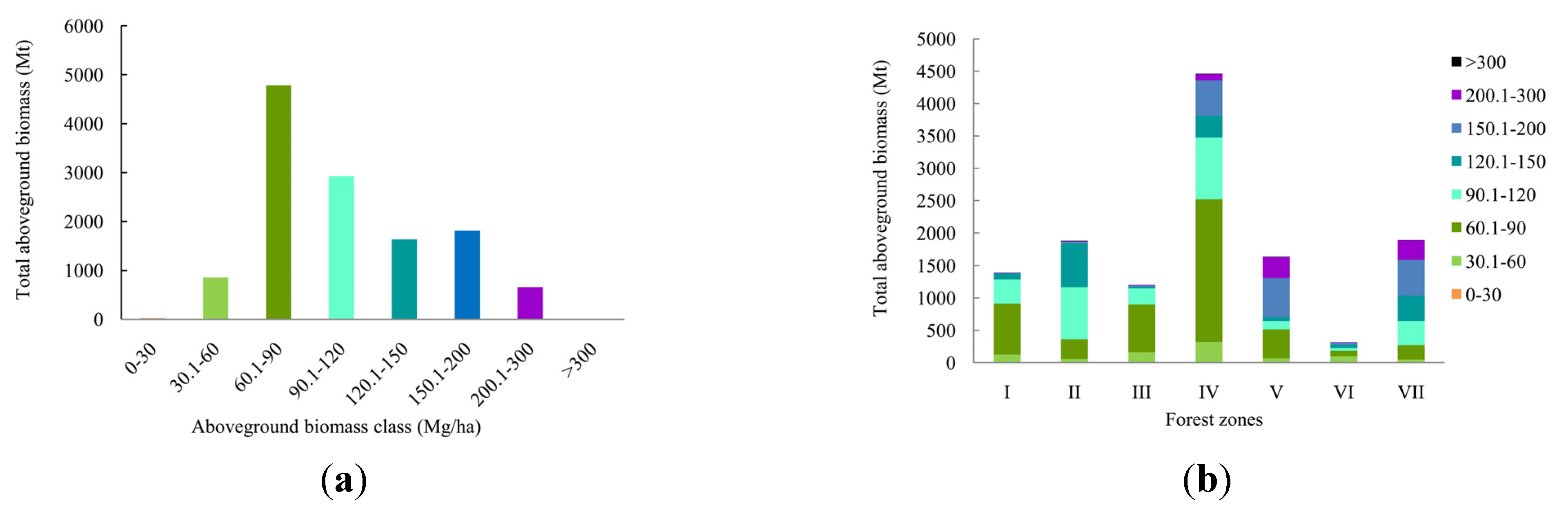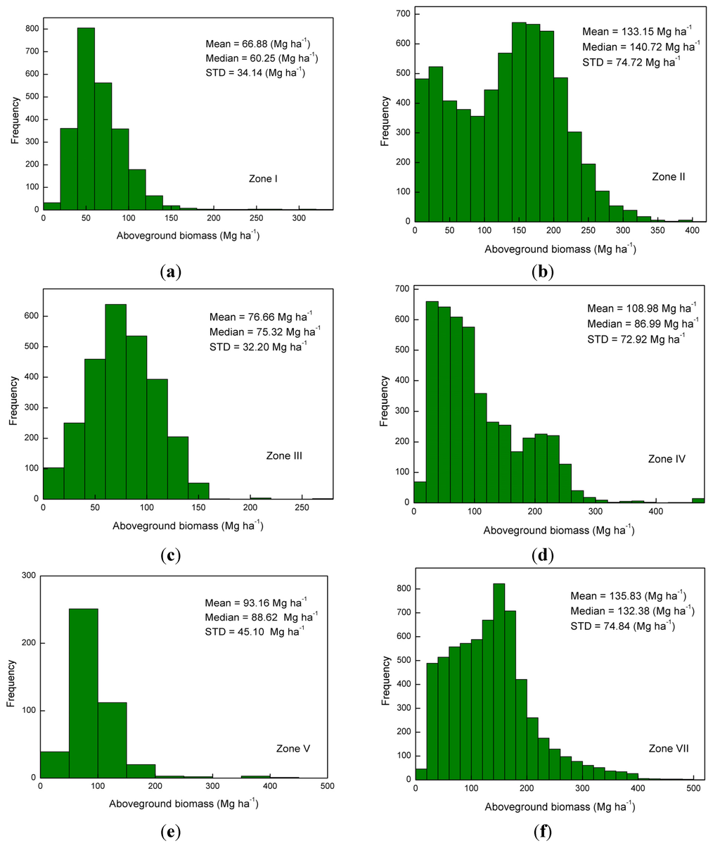 As expected, the highest forest AGB was found in the southwest of Xizang province (>300 Mg·ha−1), while the lowest forest AGB was found in Hebei province in the north, and Jiangsu province in the south (<50 Mg·ha−1). Good agreement (relative error <20%) between estimates of AGB and forest inventory data was seen in most southern provinces of China. Large discrepancies mainly occurred in provinces located in north-central and east-central China. The potential reason for this is low forest coverage in these areas. The low cover could lead to mistakes in forest/non-forest classification, producing significant differences in AGB estimation. As shown in Figure 6, the biomass ranges were different in seven forest zones. In zone I, the Northern Da Hinggan Mountains suffered from serious fires in 1987. Nearly 20 years later, a field survey was conducted in 2006, and showed that regenerated forest coverage had improved significantly under intensive management, but the stand density and canopy height had not reached levels that existed before the big fire. Before the big fire, the average biomass of larch (Larix gmelinii (Rupr.) Kuzen.) in this area was about 105.05 Mg·ha−1 [55]. After the big fire, it is expected that forest biomass density would decreased. In our research, a biomass range between 60.1 Mg·ha−1 and 90 Mg·ha−1 accounted for the major part of total AGB, consistent with the result of a previous study that the average biomass of a natural young larch forest was about 66.93 Mg·ha−1 [55]. The Xiao Hinggan Mountains has not undergone any large natural disasters in the last 20 years. Thus, forests in this region relatively undestroyed compared with the Da Hinggan Mountains. Therefore, the largest biomass range, from 90.1 Mg·ha−1 to 120 Mg·ha−1, occurs in zone II. The second largest biomass range was from 120.1 to 150 Mg·ha−1. The composition of biomass ranges in zone III was similar to that in zone I. Because the area of forested land in zone III was smaller than in zone I, the amount of total AGB in zone III was less than in zone I. Affected by the long-term human activity, forest zone III was dominated by secondary and man-made forests. Chinese pine (Pinus tabulaeformis Carr.), armand pine (Pinus armandi Franch.), and Japanese red pine (Pinus densiflora Sieb. et Zucc.) were the major species of needleleaf trees, while typical species of broadleaf trees were oak (Quercus L.) and birch (Betula L.). The average biomass of these species at the age of about 30 years were 96.37 Mg·ha−1, 88.9 Mg·ha−1, 89.27 Mg·ha−1 (at the age of 60 years), 49.13 Mg·ha−1, and 84.47 Mg·ha−1, respectively [55]. This is consistent with our conclusion that most of the forest biomass was in the range between 60 Mg·ha−1 and 90 Mg·ha−1. Forest zone IV had the largest forested area of all forest zones, and the largest total amount of biomass, ranging from 60.1 Mg·ha−1 to 90 Mg·ha−1. Of the seven forest zones, zone IV had the highest total biomass because it was dominated by middle-aged man-made forests and young secondary forests. Biomass ranges between 150.1 Mg·ha−1 to 200 Mg·ha−1 accounted for the greatest amount of biomass in zones V and VII. Zone V was mainly covered by tropical monsoon forests with high stand density and canopy height. The forest region in zone VII was located in the southeastern Xizang province, and retains large areas of virgin forest. The altitude of the mountain valley is relative low, and the region has high levels of precipitation and accumulated temperature. All of these conditions result in a high biomass range (>150 Mg·ha−1) in zone VII.
