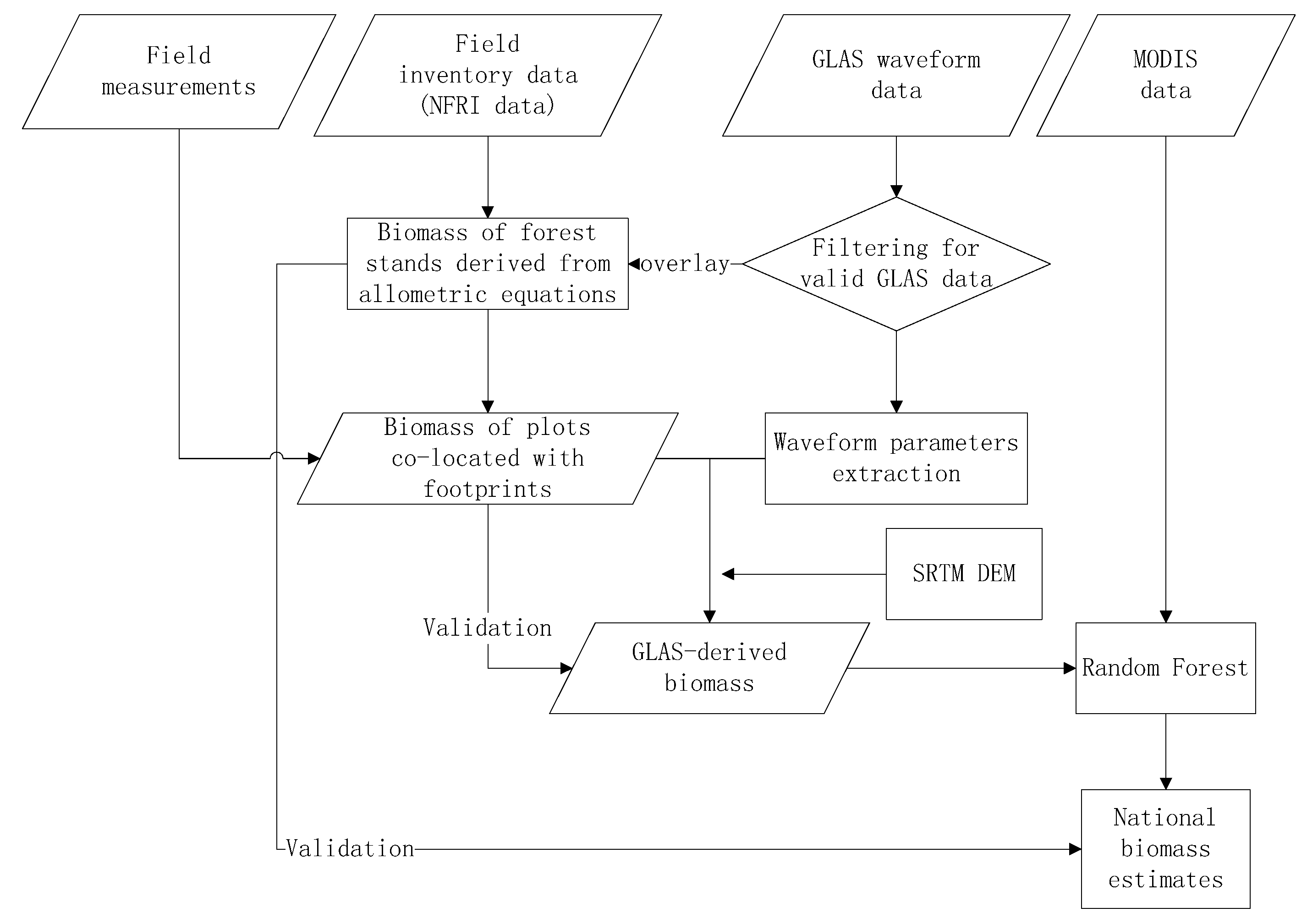 Processing flow of national biomass estimation from MODIS, GLAS, and field data.