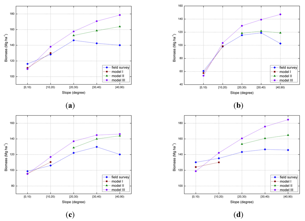 Comparison of biomass estimated from models using GLAS footprints on all slopes (purple crosses in model III), slopes <20° (brown squares in model I), and slopes ≥20° (green triangles in model II) with field survey biomass (blue diamonds) in forest zones II (a), III (b), IV (c), and VII (d). Models I and II were trained by GLAS waveform data on slopes <20° and ≥20°, respectively. Models III were developed from GLAS waveform data on all slopes.