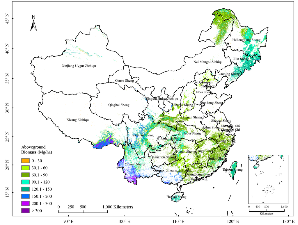 China, as one of the world’s fastest developing countries, needs to produce robust estimates of forest biomass and carbon stocks for successful implementation of climate change mitigation policies. As one of the five most forest-rich countries [46], China is rich in temperate forests and subtropical forests. Timely and accurate measurements of forest biomass and its distribution are increasingly needed to support a wide range of activities related to sustainable forest management and carbon accounting. Previous studies on estimates of forest biomass in China were based on statistical analysis of the biomass-volume relationship based on nationwide forest inventory data [47,48]. Despite the high precision of such inventories, they do not provide maps of biomass at a resolution useful for assessing land-use change. An AGB map of China with clear and detailed spatial distribution is urgently needed. However, the benchmark map of Saatchi et al. [4] did not cover the entire land of China. Similarly, the pan-tropical map generated by Baccini et al. [20] only covered the area in southern China (below 30°N). More importantly, no field survey samples from the Chinese territory were included in the two studies.