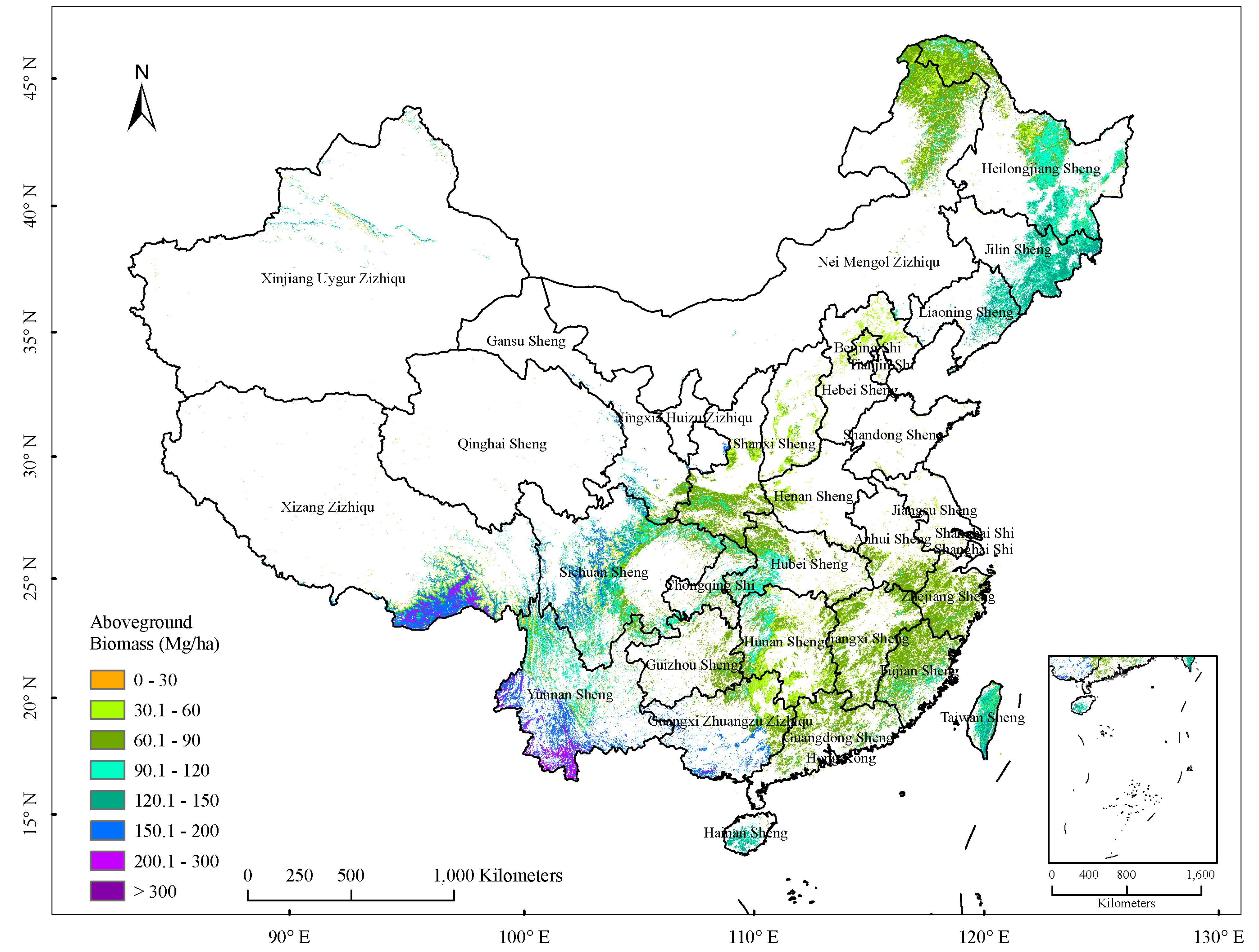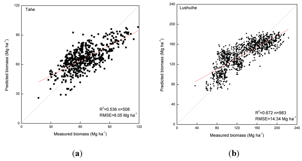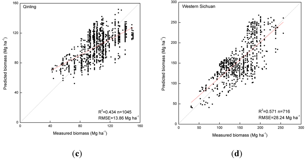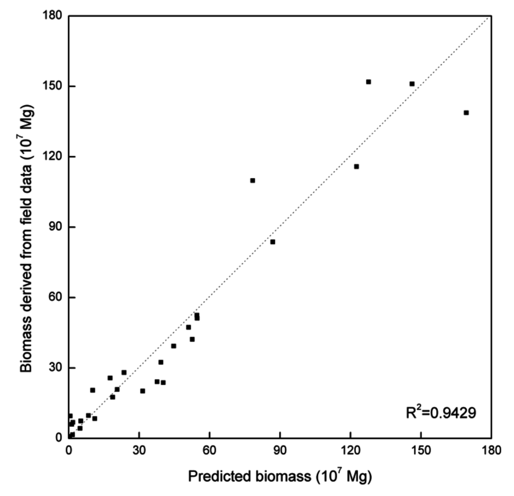 Traditionally, a large number of ground based sample surveys were conducted in a target area and maps of biomass were derived using the forest inventory in combination with land cover maps to assign average value of biomass density to each land cover category. This method may not be adequate for describing the local spatial variability in biomass [48]. Alternatively, a more spatially consistent method to produce biomass maps over large regions was to find the relationships between in situ biomass and a remote sensing signal using a number of statistical models or machine learning techniques and apply the prediction models to each pixel. In our study, we adopted the latter method, to better describe the spatial variability in biomass over China.