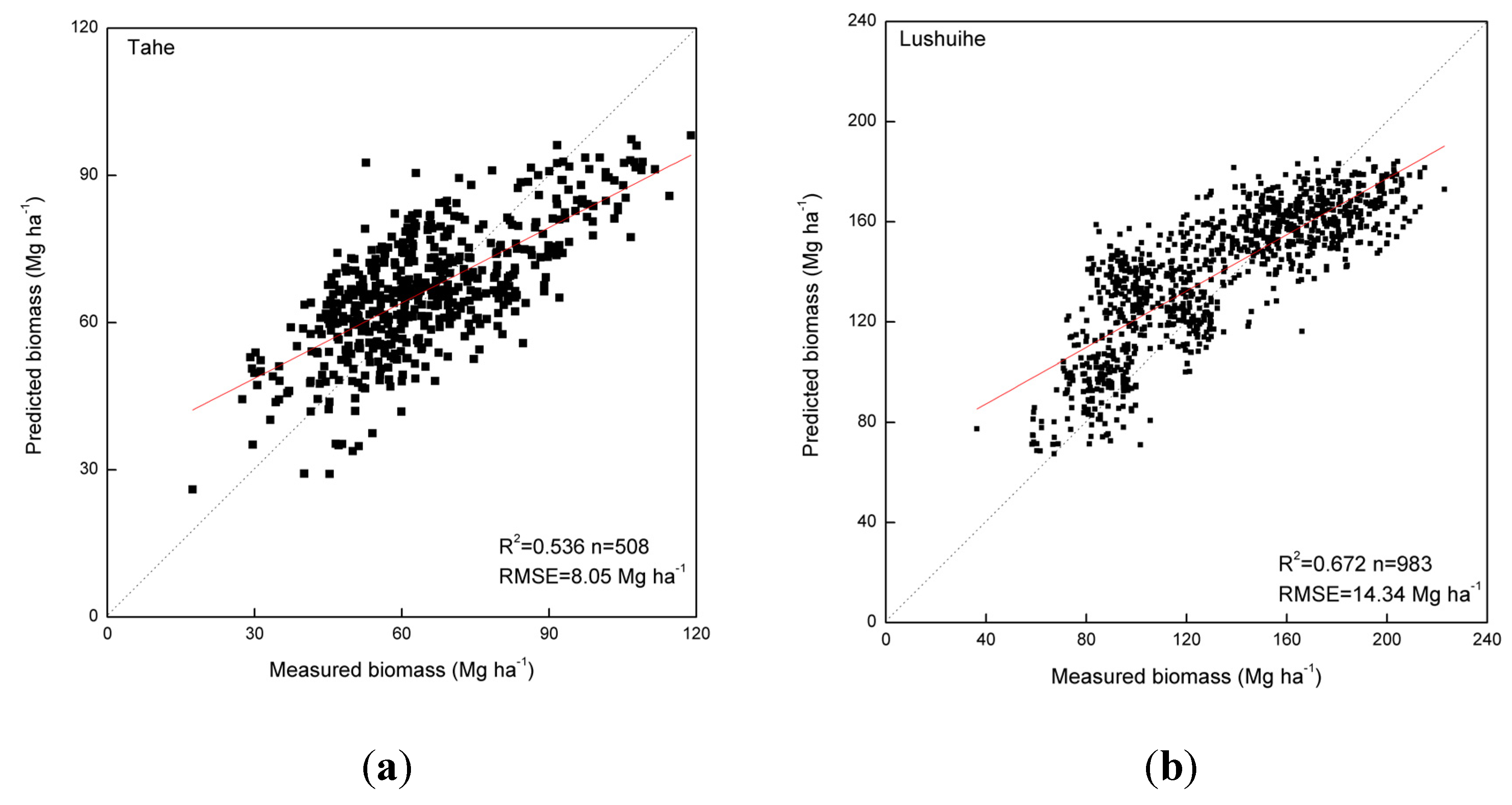 Stepwise regression was performed to predict AGB in GLAS footprints. Compared with other machine learning methods (such as decision tree or neural networks), the regression method was not limited to the range of data, and showed the ability to yield reasonable results, similar to complex methods [20,66]. To infer GLAS metrics that had high correlation with biomass and to discard parameters that had less effect on biomass estimation, t-tests and F-tests were conducted to identify the predictive waveform parameters and the overall correlation of regression models. Neter and Wasserman [67] described how to use the two methods to make comparisons of regression parameters and test whether any two regression lines are identical. The coefficient of determination (R2) is widely used to evaluation of goodness of fit for the regression models. As the number of explanatory variables increases, the R2 values also increase. However, the additional explanatory variables may not be significant, and do not substantially improve R2. Therefore, R2 is not appropriate for a comparison between models having different numbers of explanatory variables [68]. Adjusted R-square (R2-a) was adopted for the comparisons. The root mean square error (RMSE) was used to assess the predicted AGB versus AGB estimated from field-observations at the footprint level.