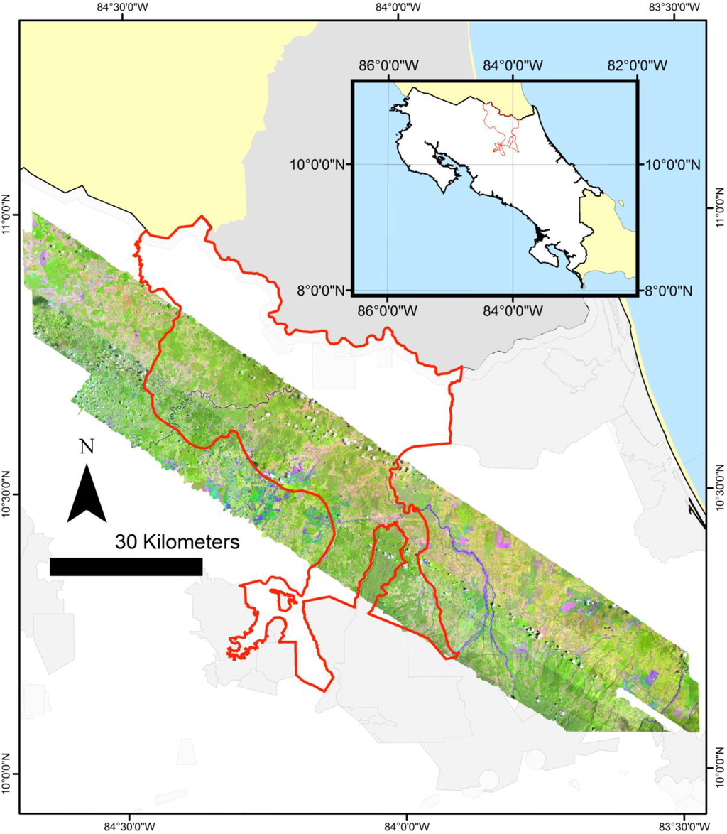 To evaluate the extent of reforestation in this landscape, we mapped the narrow central waist of the San Juan-La Selva Biological Corridor and adjacent areas using aerial hyperspectral imagery (Figure 1). Adjacent areas outside the SJLSBC were mapped to the northwest and southeast (along flight lines) within Costa Rica (hereafter, the “study region”; Figure 1).