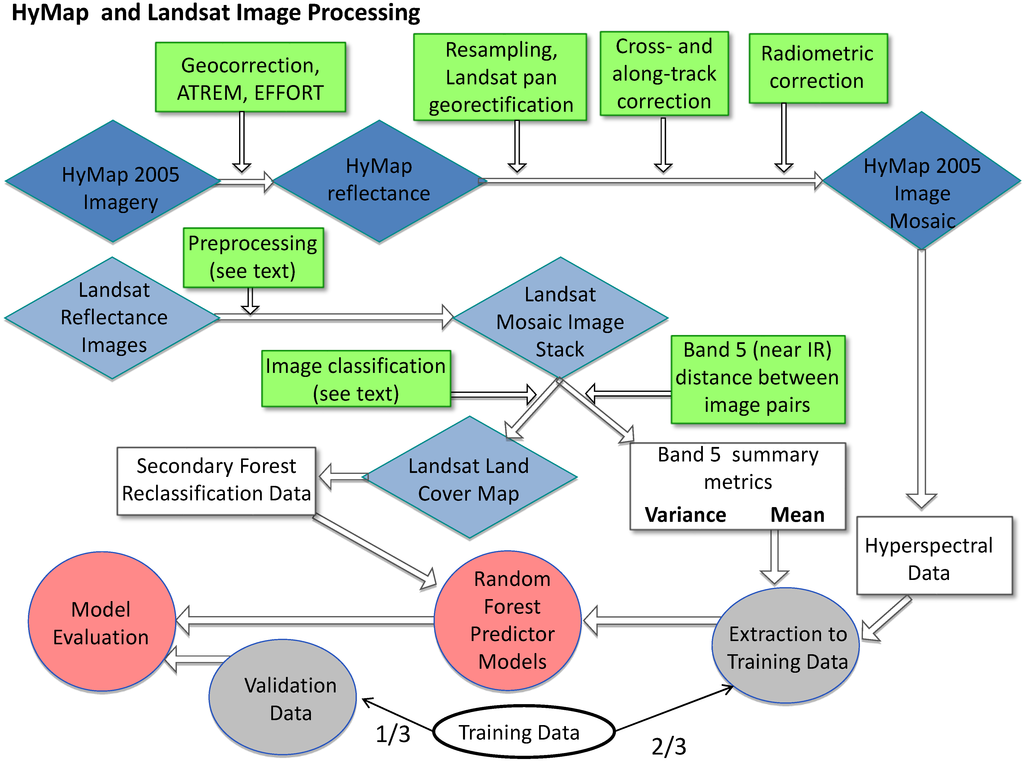 Image pre-processing and processing steps to normalize reflectance values and improve image quality for enhancing discrimination of forest types and plantation species are summarized in Figure 2. We used the HyMap surface reflectance data products released by HyVista, which included georectification from onboard DGPS, ATREM model processing to correct for atmospheric effects, and EFFORT polishing of reflectance values, described in Arroyo-Mora et al. [97]. We resampled HyMap images to the mean pixel size (15 m) using the nearest neighbor method and co-registered image tiles to a 2005 Landsat 7 pan image (<7.5 m root mean squared error (RSME); Table A1) using an automated tie point program [98]. Clouds, cloud shadows and terrain shadows were masked from each image using manual decision trees based on NDVI and hyperspectral bands centered on 460, 500, 1170, and 1460 nm. We corrected the masked images for cross-track and along-track illumination differences using a bilinear cross-track correction algorithm (A. Singh, in prep). Because of differences in illumination among image dates and residual errors from georectification (<7.5 m RSME), we conducted cross-image illumination correction using the haze correction relative normalization method [99], selecting the reference normalization image that had the lowest blue-band reflectance in shadowed areas (Table A1).