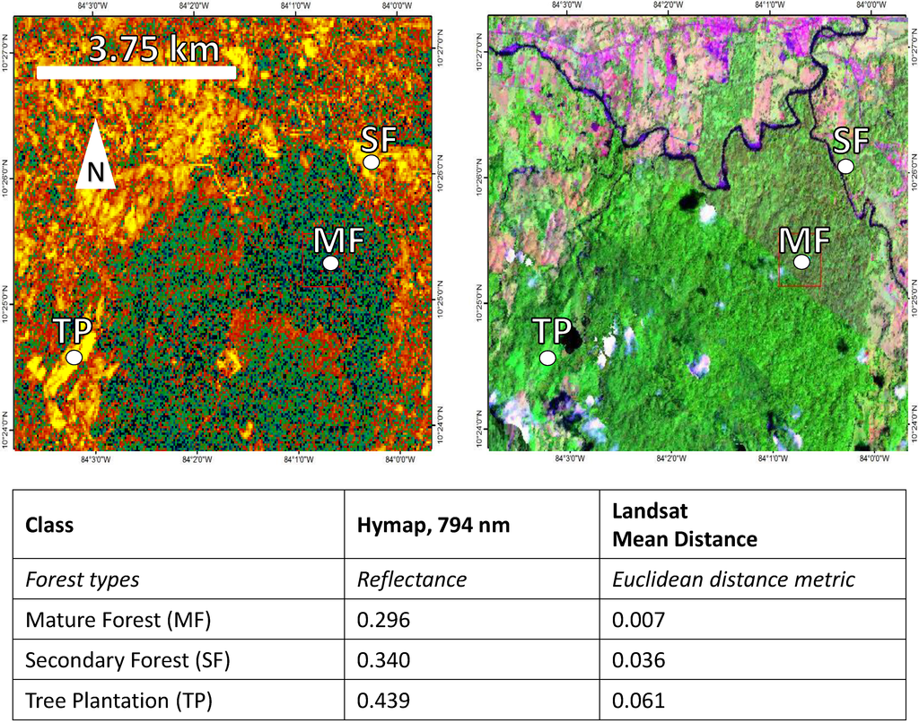 Two images of La Selva Biological Station, with land-use classes labeled at points for illustration, and a table showing the spectral values of the points in each image. Image A (left) shows a metric derived from Landsat imagery—the mean of the Euclidean distance (ED) in Band 5 between all four image pairs in a Landsat image stack (1986–2005). Warmer colors signify greater mean change in Band 5 over time; both reforestation and deforestation events show high mean change; Image B (right), showing the same area, is a three-band HyMap reflectance composite (593:794:534 nm). To illustrate radiometric variation between images, the highest spectral contrast between two image tiles in the entire HyMap image mosaic can be seen just below the mature forest point, in the bottom left corner of the red box.