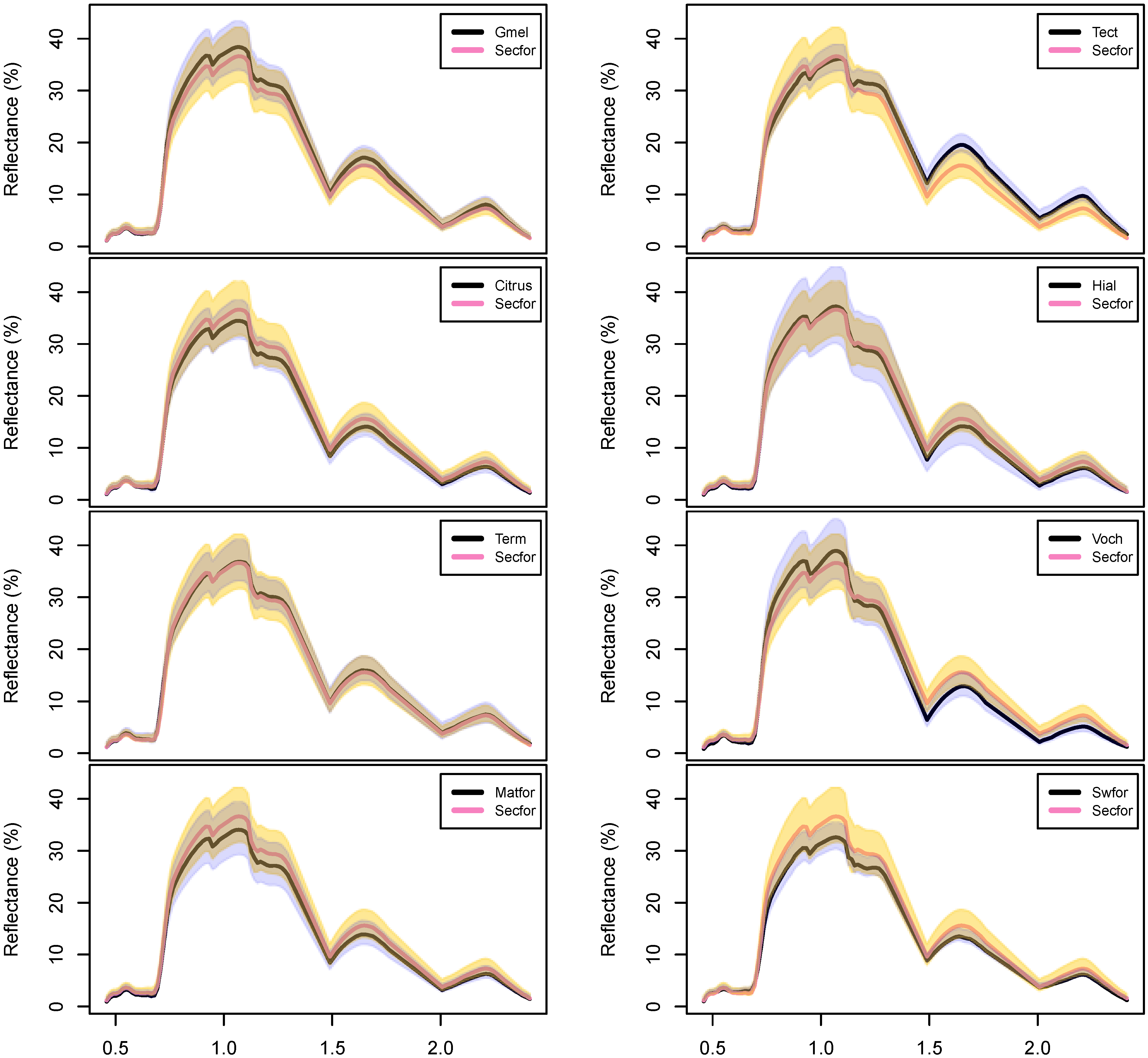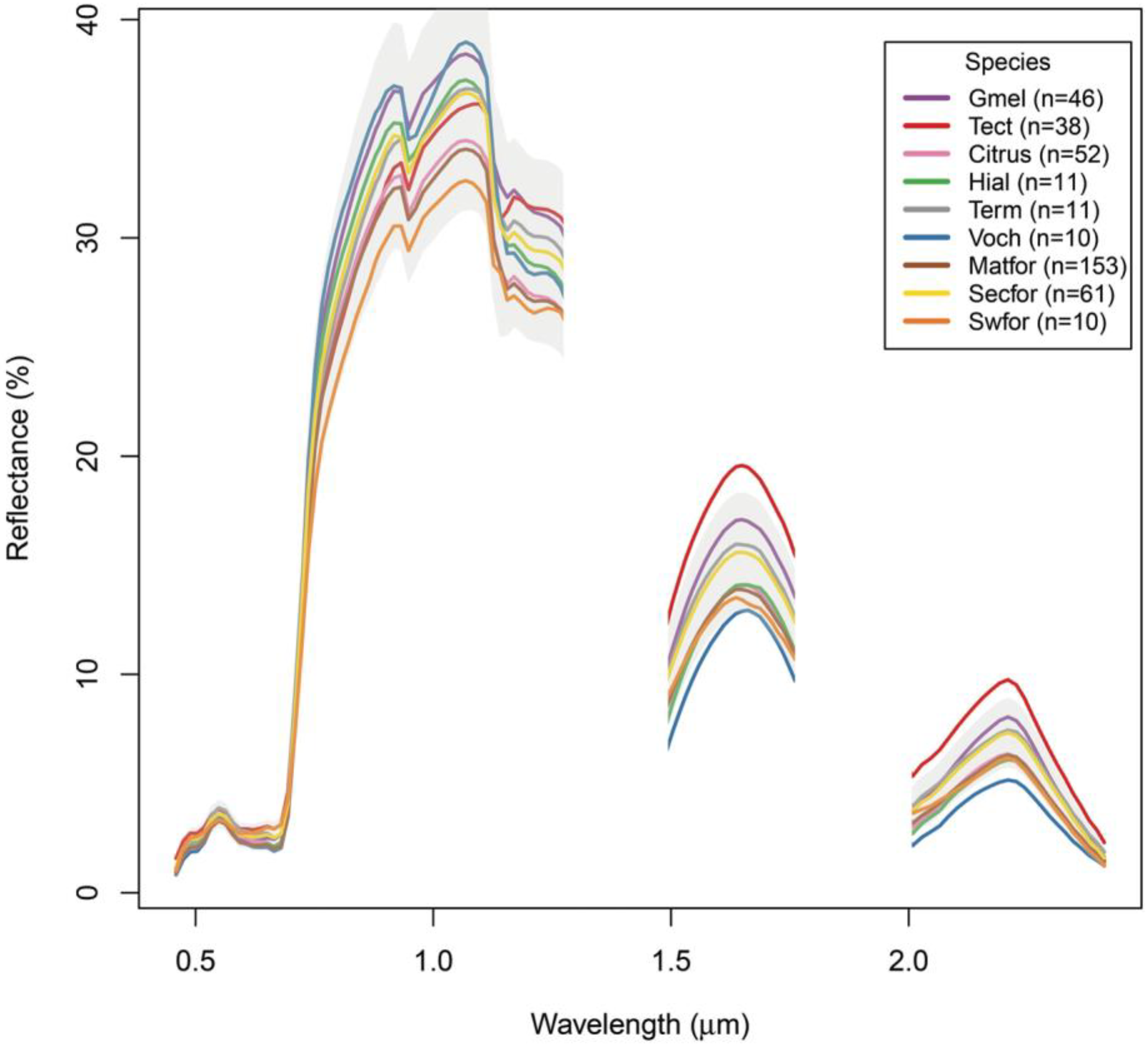 Mean hyperspectral reflectances for the forest classes in this analysis, derived from the HyMap imagery at the training data locations. Class sample sizes are shown in the legend; see Table 2 for class name acronyms. The gray polygon represents one standard deviation above and below the yellow secondary forest class (abbreviated here as “Secfor”). Water-absorbing spectral regions (centered on 1.3 and 1.9 µm) were excluded from the analysis and are not shown.