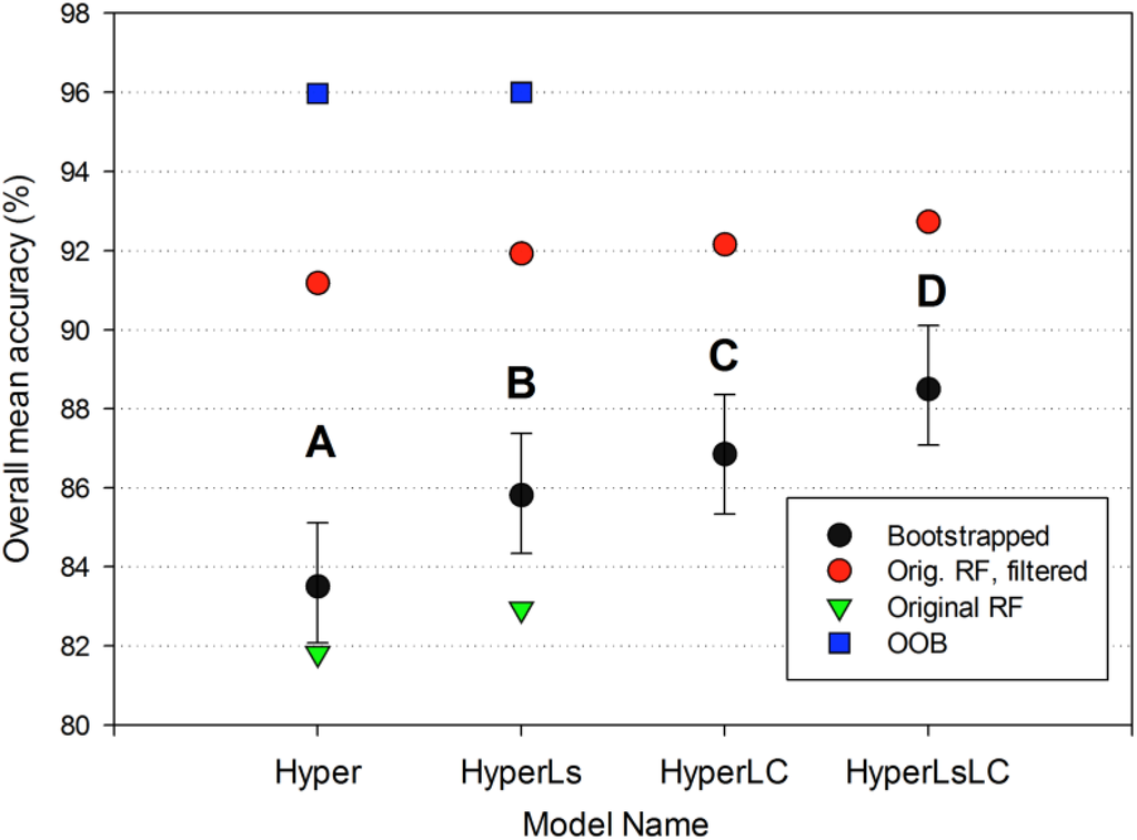 The Random Forest (RF) machine learning algorithm was used to develop a classifier for the LDA-processed hyperspectral and Landsat image data [108]. Random Forest is an ensemble decision tree classifier that is non-parametric and flexible with regards to data distributions and assumptions (see [108] for a full description). RF has been used for hyperspectral classification [45,109,110] and the analysis of datasets with hundreds to thousands of potentially correlated predictors (e.g., [111]). We implemented RF using the RandomForest package in the R statistics package v. 2.14.1 [112], with default settings and n = 1000 decision trees per classification.