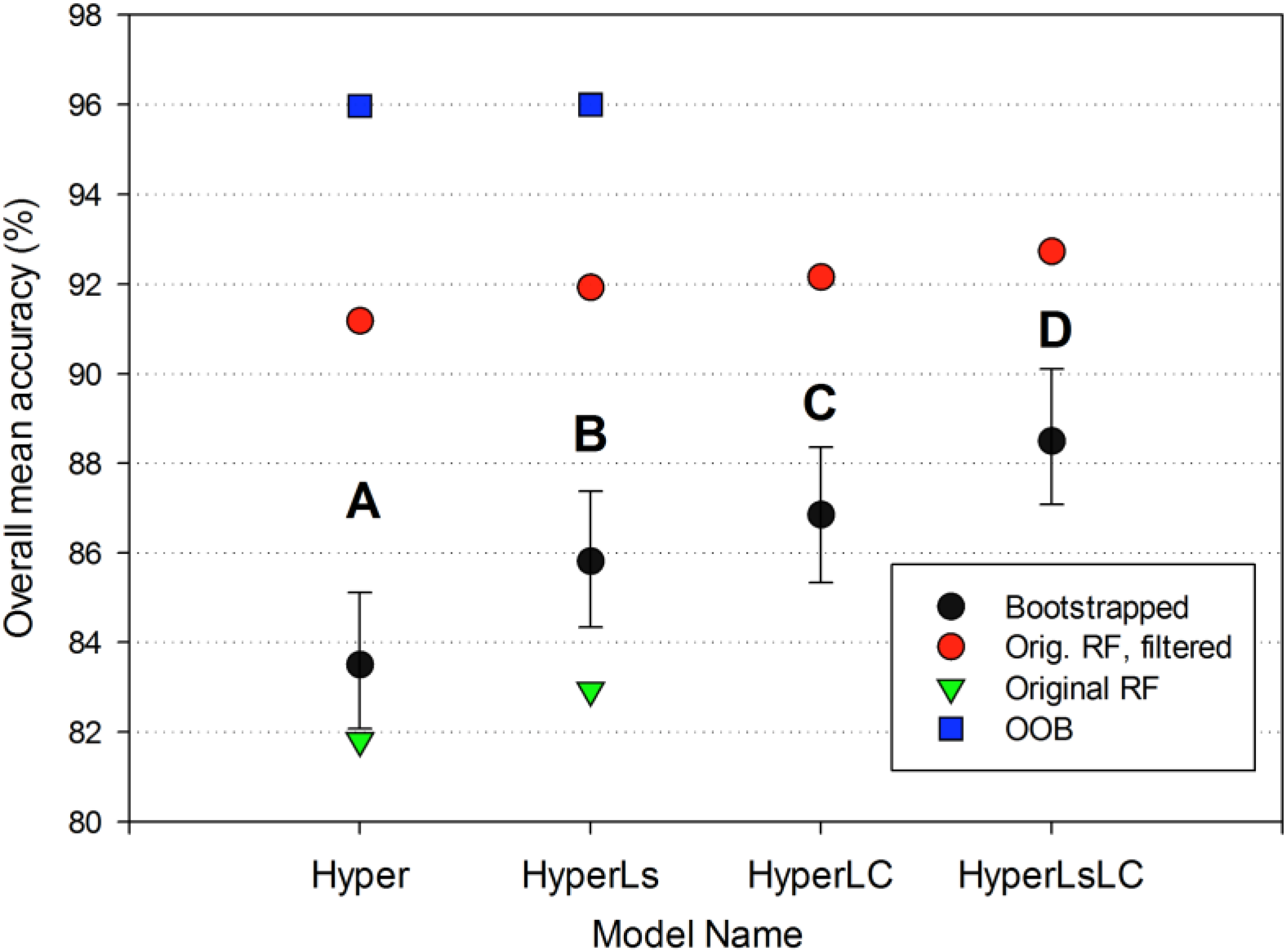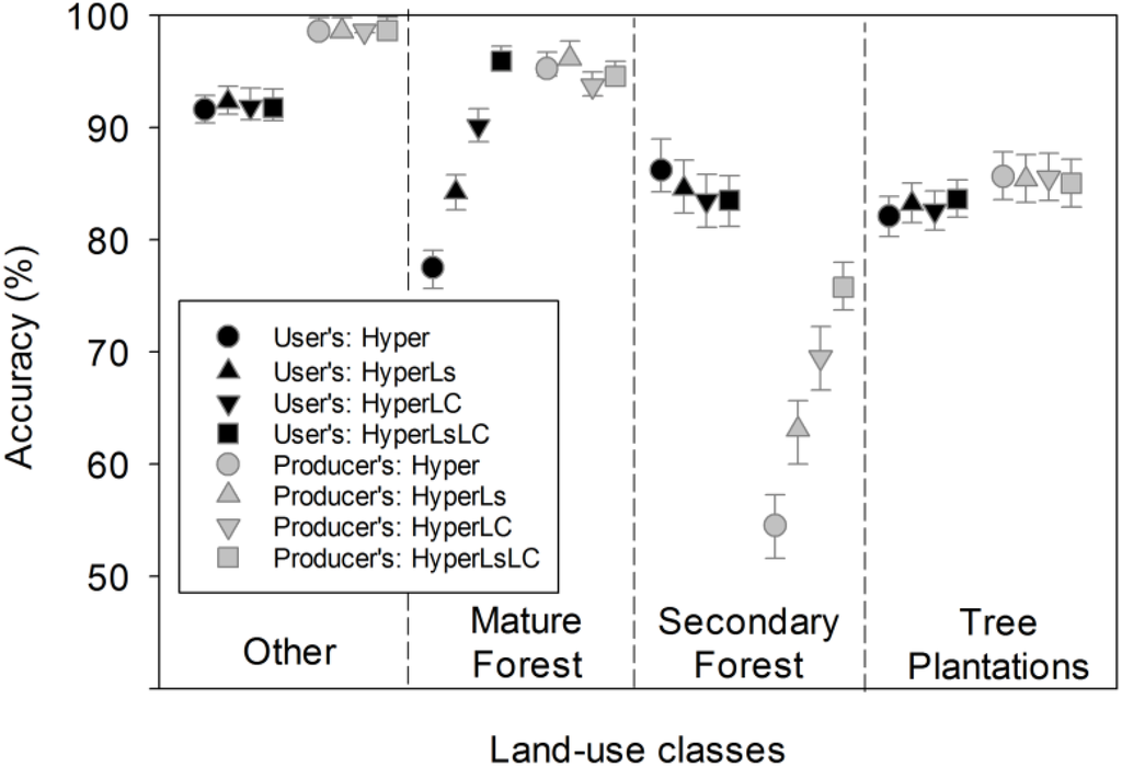 The post-processed classification results from Hyper and HyperLs were the starting points for the HyperLC and HyperLsLC models, respectively (Figure 2, Table 3). We used the Landsat-derived 2005 reforestation mask to reclassify mature forest in the Hyper and HyperLs land use maps to secondary forest. We then assessed the accuracy of the reclassified land use maps for the HyperLC and HyperLsLC models.