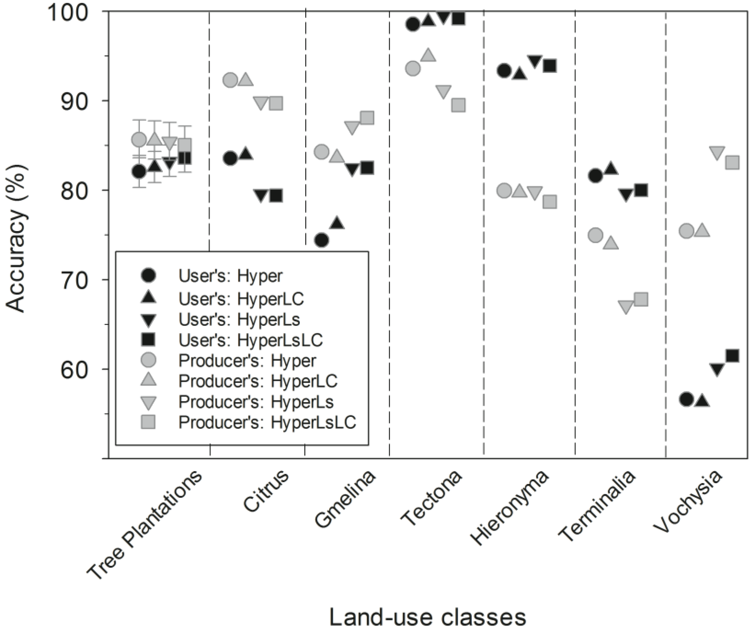 To meet our second objective and examine how well hyperspectral and Landsat data distinguish tree plantation species composition, subsequent analyses focused on classification accuracy for individual tree species in areas classified as tree plantations. Thus, we reported the class accuracy of tree plantations both as a single land cover class and by species composition.