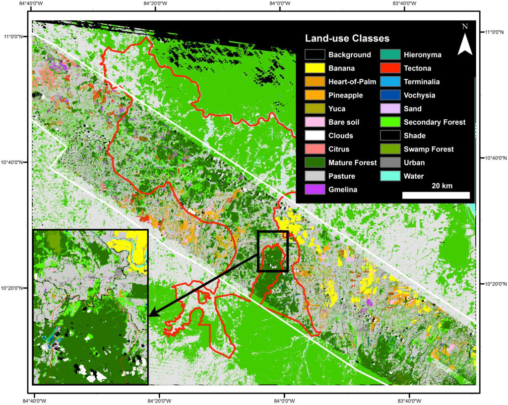 The study area encompasses principal reforestation areas in the lowlands of northeastern Costa Rica, covering a total of 4509 km2 (Figure 1). We selected this region for study because of the extensive availability of satellite and airborne remote sensing data, a history of large-scale reforestation efforts, and the presence of an established PES program (1996) that subsidizes tree planting and maintenance among landowners. Ongoing partnerships between American and Canadian space agencies and the Costa Rican government have led to numerous aerial missions in the last decade to collect hyperspectral, LiDAR, SAR, and high-resolution multispectral data across much of the country [83,84]. The long-term rainforest monitoring plots, experimental tree plantations, and secondary forests at La Selva Biological Station have been the particular target of remotely sensed data collection.