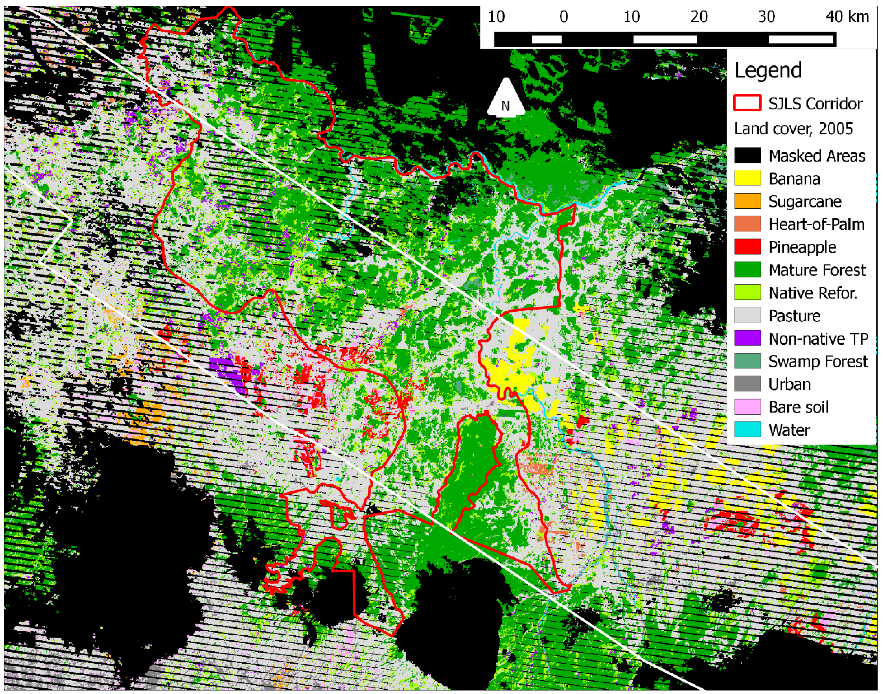 Previous satellite image-based land-cover maps of the SJLSBC have not successfully distinguished tree plantations or individual tree plantation species from other forest types at regional spatial extents [9,36,37,38]. However, high loss rates of reforestation (a land cover category including both secondary forests and tree plantations) have been observed in this region [9,25,29]. As a result, the long-term persistence and composition of tree plantations in this landscape remains unclear [9].