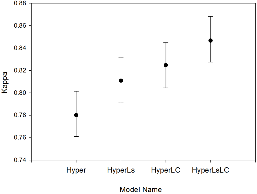 We compared four separate models integrating multitemporal Landsat data into a single-date hyperspectral classification (Table 3). The first classification model (“Hyper”) consisted of hyperspectral data only. A second model (“HyperLs”) used both the hyperspectral data and two metrics derived from multitemporal Landsat spectral data (i.e., the mean and variance of band 5 over the image composite time series) as predictor variables in a supervised classification. The third model (“HyperLC”) modified the Hyper results post-classification using the time series of Landsat land-cover data to reclassify mature forests as secondary forest where they intersected Landsat time series-derived secondary forest. The fourth model (“HyperLsLC”) was exactly the same as the third model, except that it modified the results of the HyperLs classification model.