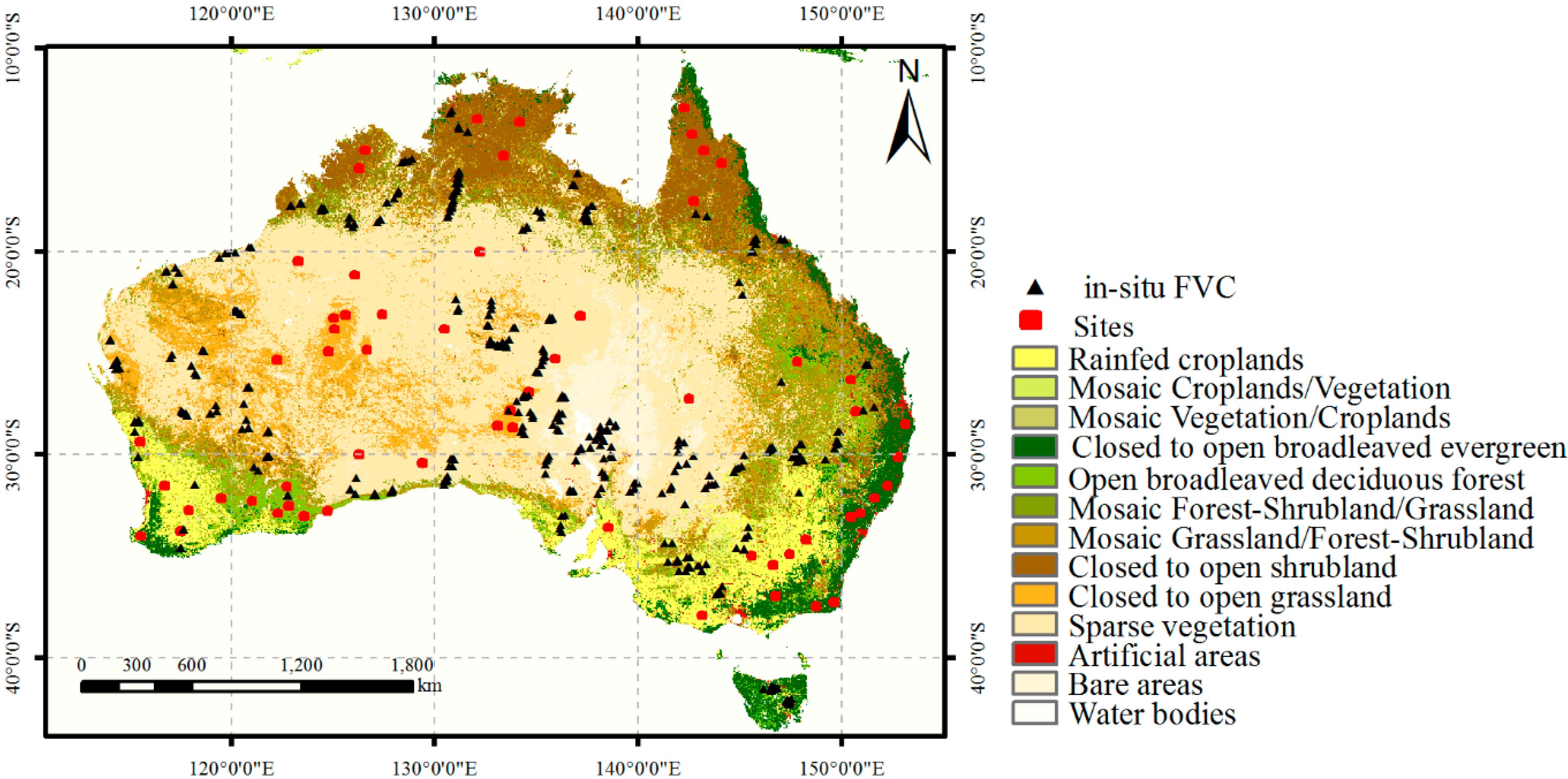 An extensive database of ~400 FVC estimates across Australia was obtained from the Australian Bureau of Agricultural and Resource Economics and Sciences (Figure 1) during the period 2011–2012. The data set consists of estimates of PV, NPV and BS cover at three defined vegetation levels: Ground cover, mid-story vegetation and over-story vegetation. Typical sampling areas were 100 m × 100 m. The presence/absence of PV, NPV or BS along a transect at 1 m intervals was determined for each vegetation level. Exposed cover was the first cover seen when looking down on the transect point and estimated the view seen by the satellite. In this study, we only used the exposed cover of PV. Detailed introductions of the sampling strategy applied were described in [18,28,29].The in-situ exposed cover of PV was used to validate the GEOV1 and Australian MODIS FVC products.