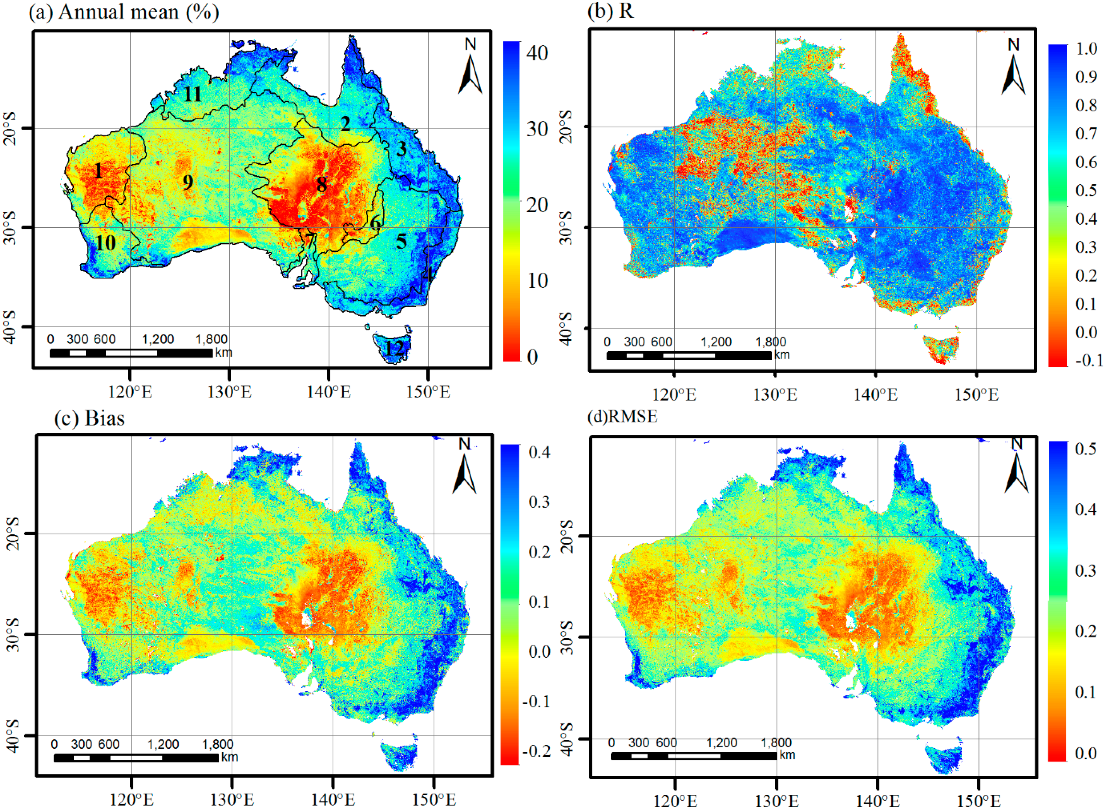 (a): Annual mean of the Australian MODIS FVC for the period 2000–2012. (b–d): the R, bias and RMSE between the GEOV1 FVC and the Australian MODIS FVC for the period 2000–2012. Drainage divisions across Australia: North-East Queensland Coast (3), South-East Australian coast (4), Tasmania (12), Murray-Darling Basin (5), Western Australia coast (1,10), Northern Australia (2, 11), Central Australia (6, 7, 8), and Western Plateau (9).
