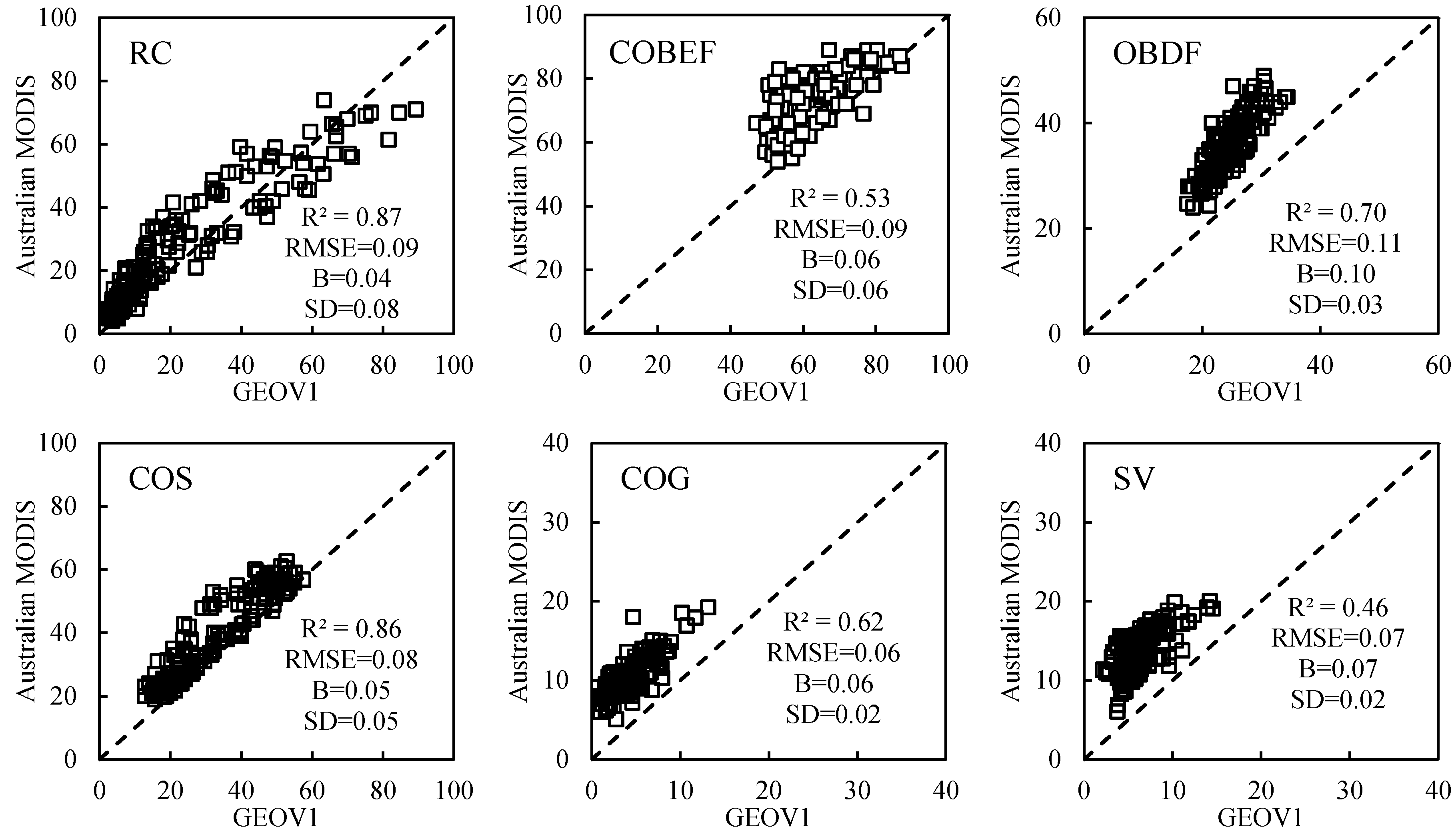 The comparison between GEOV1 and Australian MODIS provides low agreement over COBEF and OBDF (RMSE = 0.09 for COBEF and RMSE = 0.11 for OBDF) with relatively high biases (B = 0.06 for COBEF and 0.10 for OBDF) mainly coming from the lower GEOV1 FVC values over dense forests [20].