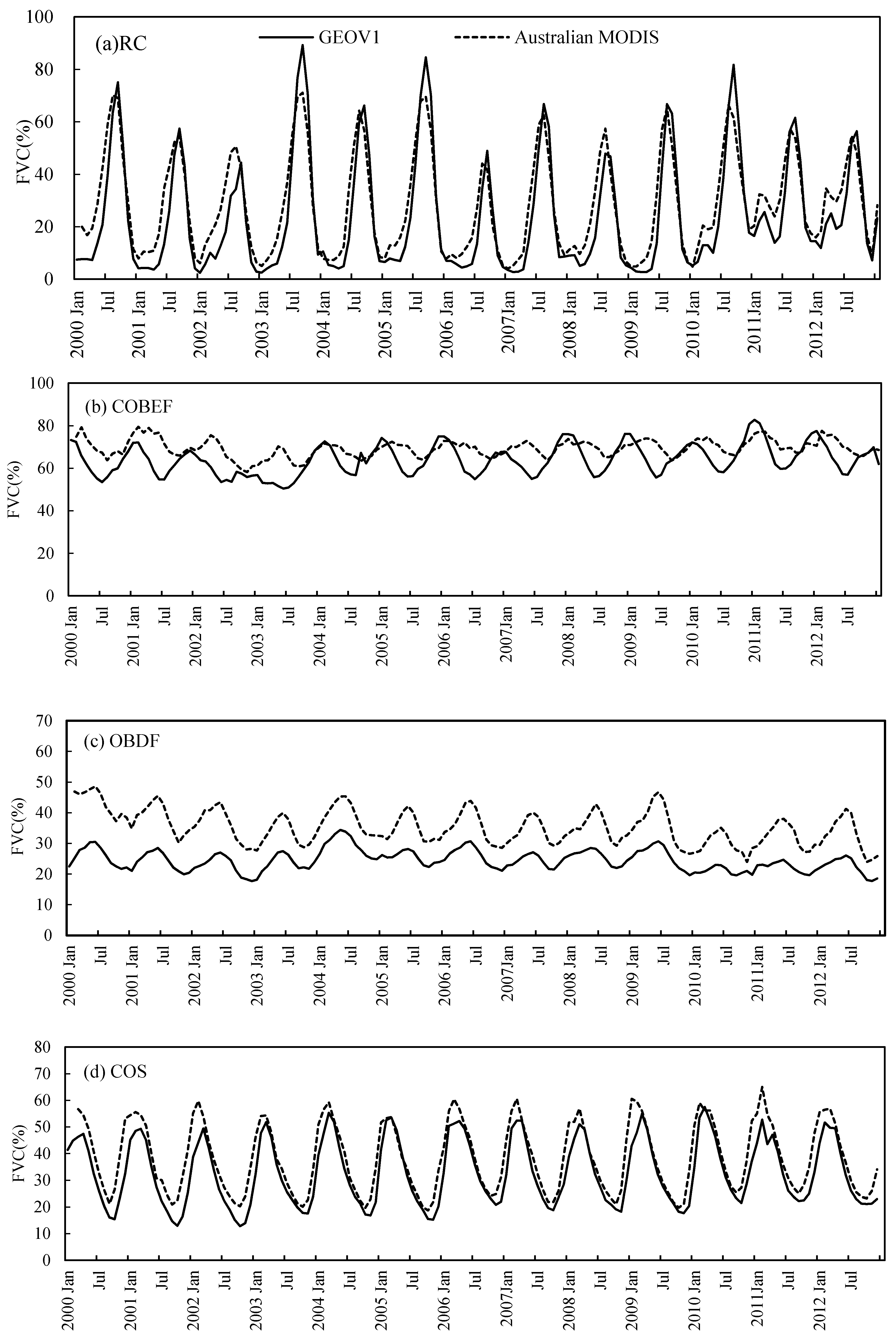 In summary, these two FVC products generally capture the temporal variations and present seasonal evolutions with higher values in the wet season and lower values in the dry season. The Australian MODIS and GEOV1 FVC show similar seasonal profiles over most biome types. The values of GEOV1 are systematically lower than Australian MODIS.