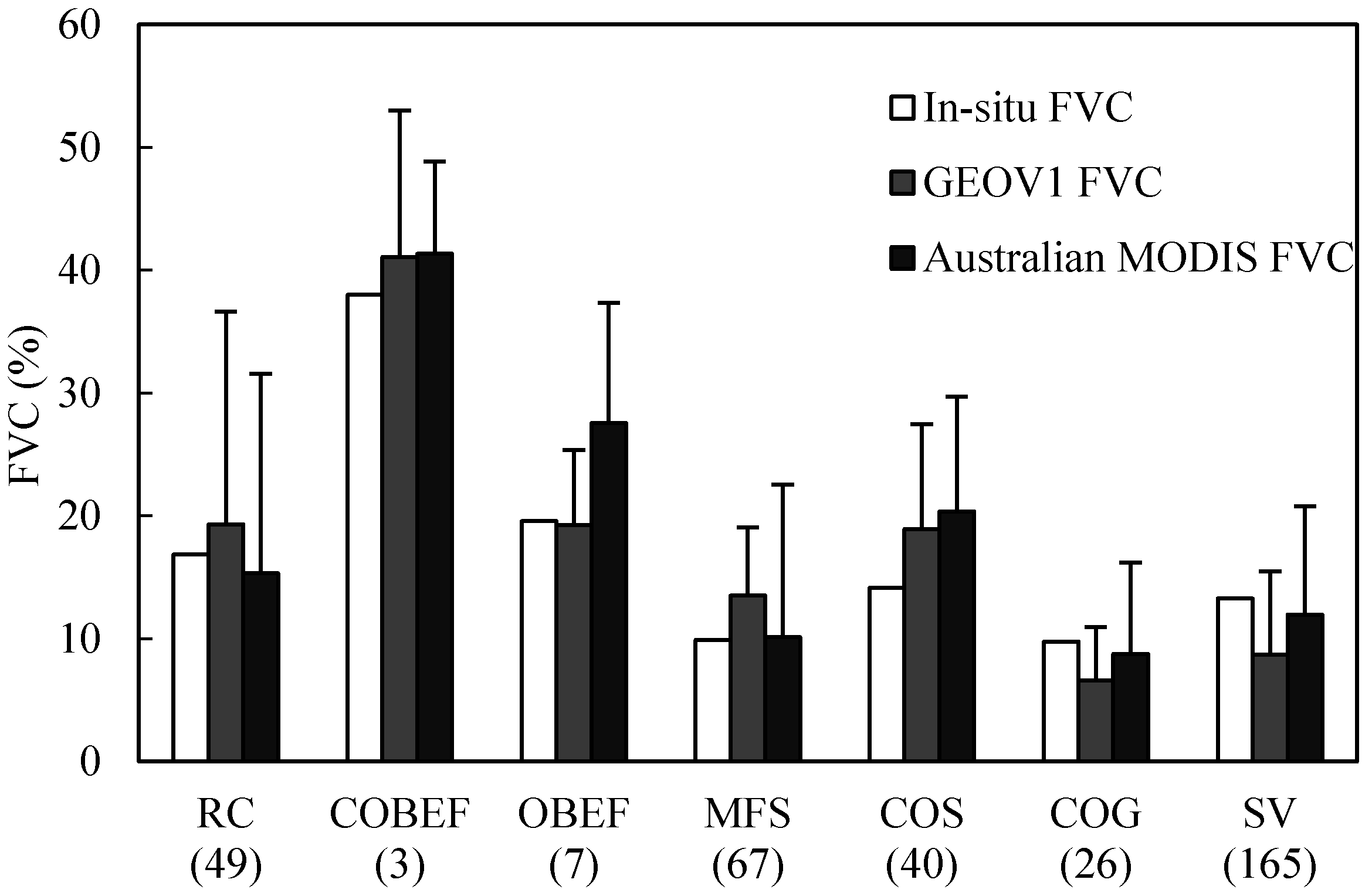 Ground FVC measurements were distributed in Australia across a wide range of geographical areas. The sampled biome types in the data set included RC, OBDF, MFS (mosaic forest-shrublands), COS, COG, SV. Half of the sampled points are distributed over SV (n = 165). The FVC values in the data set range from 9.76% ± 8.53% for COG to 38% ± 26.42% for COBEF. Vegetation classes with the highest FVC values are in the order of COBEF > OBDF > RC > COS, whereas those with the lowest FVC values are in the order of COG < MFS < SV. Only the GEOV1 and Australian MODIS FVC products are validated by the in-situ data set because the temporal coverage of CYCLOPES FVC product is from 2000–2007. The FVC products with the original spatial resolutions and temporal compositing period that are close to the range of time for the in-situ measurement acquisition were selected and directly compared with the in-situ FVC values. The numbers of validated points are similar for the GEOV1 and Australian MODIS FVC products. Compared with the ground FVC, the Australian MODIS product overestimates the FVC of OBDF and COS biome types (Figure 5). For RC, COG, and SV biome types, the Australian MODIS product estimates lower values than the field values. The Australian MODIS product is more consistent with the field FVC than the GEOV1 product over MFS. The FVC values of the OBDF derived from the GEOV1 FVC product agree well with the field measurements. The GEOV1 FVC product overestimates the FVC values of RC, MFS, and COS while underestimating the values of COG and SV.