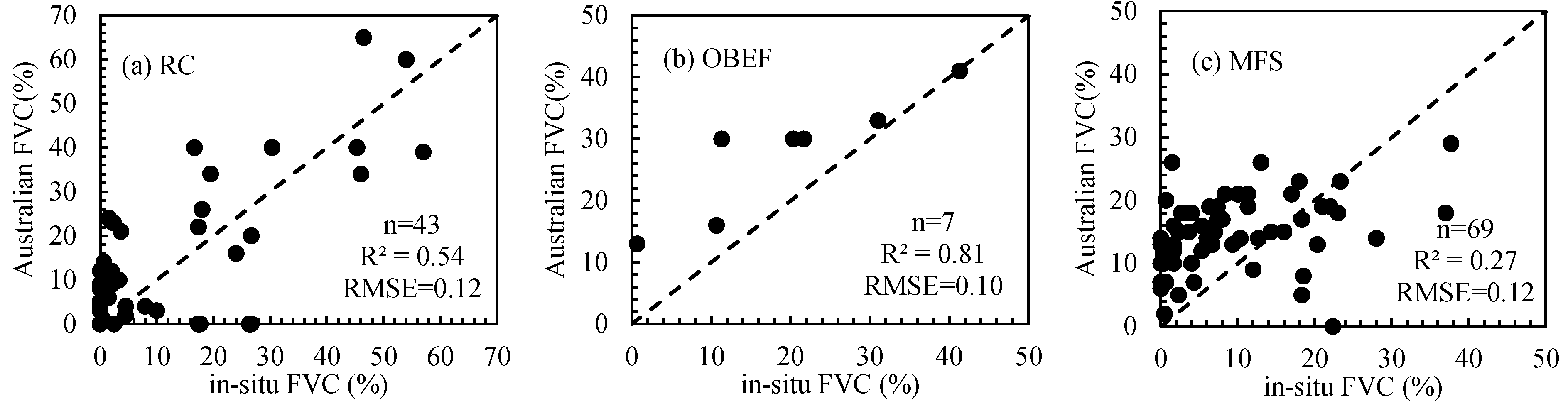 The following scatterplots are used to assess the consistencies between the FVC products, which are generated over the six evaluating units, using the mean values of each evaluating unit from the months of the 2000–2012 period, for the main biome types over the Australian continent (Figure 3).