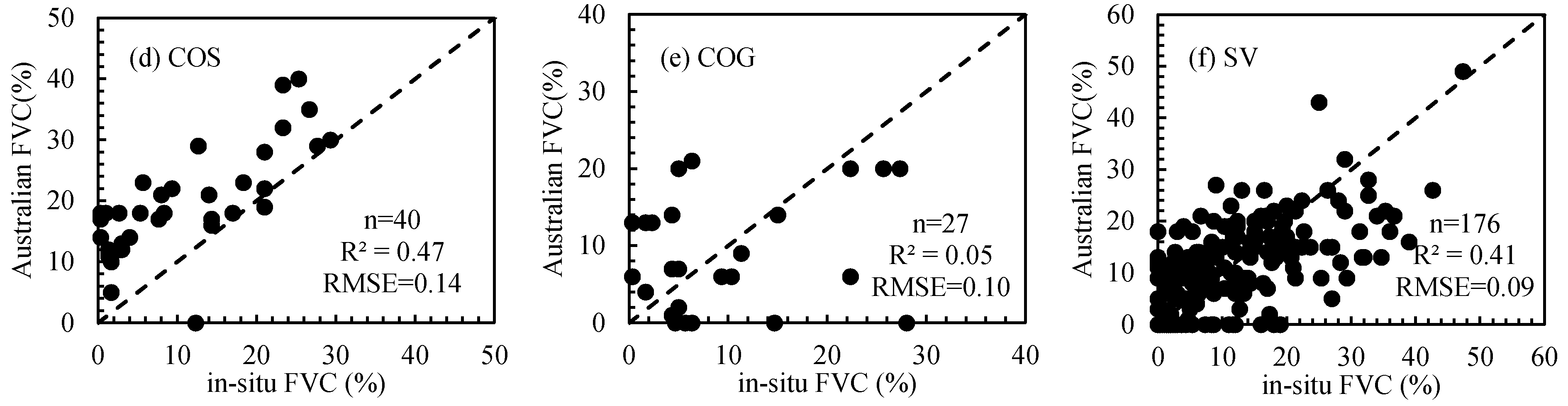 Australian MODIS provides larger FVC estimates than GEOV1 over all the biome types. No significant scattering (low SD) is observed between these FVC products. GEOV1 and Australian MODIS are better correlated over RC and COS with higher R2 values than over other biome types. Relatively low biases are observed between GEOV1 and Australian MODIS (B = 0.04 for RC and 0.05 for COS).Similar agreement is achieved for these two biome types (RMSE = 0.09 for RC and 0.08 for COS).