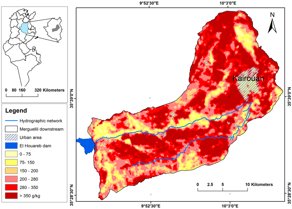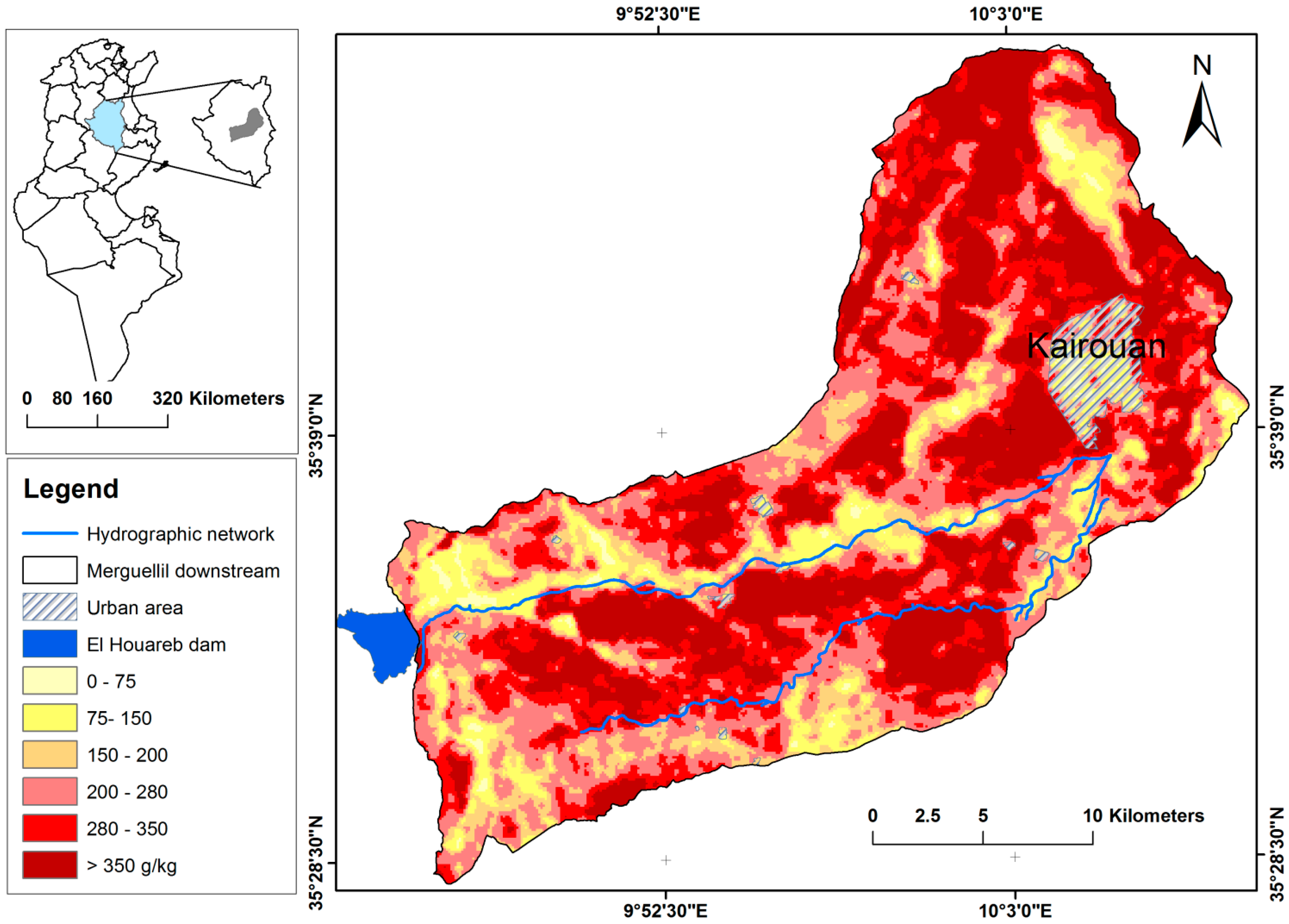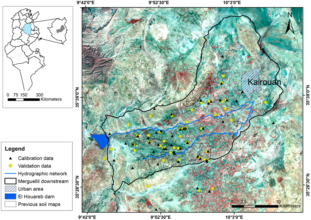 The Kairouan plain [31] is located in central Tunisia (9°30′E–10°15′E, 35′N, 35°45′N) (Figure 1). The climate in this region is semi-arid, with an average annual rainfall of approximately 300 mm/year, characterized by a rainy season lasting from October to May, with the two rainiest months being October and March. As is generally the case in semi-arid areas, the rainfall patterns in this area are highly variable in time and space. The landscape is mainly flat, and the vegetation is dominated by agricultural production (cereals, olive groves, fruit trees and winter and summer market gardening). Soil units reflect high spatial and vertical variability of alluvial deposits, except along wadi. The last flood of 1969 changed some soil horizons with sandy deposits of up to 100 cm and existing soil maps may become outdated. The dominant major soil group is classified as Fluvisols and saline soils [32]. Soil texture presents a large spatial variability from the south to the north of our region [33]. The clay content is ranging from 15.3 g/kg to 684.58 g/kg. Mainly four soil units exist in the study area. The first unit includes Vertic saline soils. The second unit is Fluvisols characterized by a loamy soil texture located near the wadi bed of Merguellil. Another soil unit includes Fluvisols with coarse soil texture on the downstream part of the Merguellil River. The last soil unit, located in the north of Kairouan, includes clayey soil. Vertic soil is an indicator of the presence of montmorillonite clay. The organic matter rate is very low, near 0.5% from the surface to 10 cm, which corresponds to an isohumic diagnostic property of all soil units.