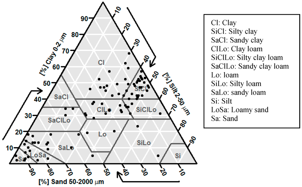 Soil texture maps are difficult to derive. Existing soil maps are neither exhaustive nor precise enough, and often describe soil types rather than texture. Point measurements through soil analysis can be performed to complete those maps but are expensive and dense sampling is required to characterize adequately the spatial variability, making broad-scale quantitative evaluation difficult [4]. Moreover, laboratory analysis performed by chemical treatments are expensive and time-consuming [5,6]. New and quick methods to measure soil properties and variability are required for the development of soil interpretations [6,7].
