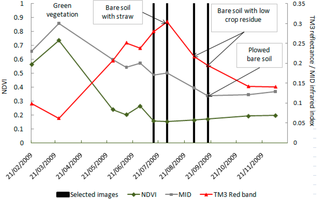 Estimation of soil properties such as clay content is hampered if the pixels have a vegetation cover over 20% and also if the pixels are covered by crop residues [38]. We need rapid, accurate, and objective methods to detect residue cover and green vegetation in individual fields. Crop residue and soil are often spectrally similar and differ only by the magnitude of the reflectance in visible and near infrared wavelengths [39,40,41,42]. In fact, to extract bare soil extent over the Kairouan plain, we have to select Landsat TM data, which minimize the influence of soil moisture due to rain or irrigation. We also need to avoid crop residue after crop harvesting. To do so, we selected, in a first step, nine Landsat TM images with little influence of soil moisture due to rain on the basis of rainfall observations at meteorological stations. High soil moisture content decreases soil reflectance. In the second step, we retained only four images (17 July 2009, 1 August 2009, 2 September 2009 and 18 September 2009) in the summer season to avoid soil moisture due to local rain and irrigation. These images contain three types of pixels: bare soil pixels, plowed bare soil pixels and bare soil with crop residue. To extract only bare soil and to identify the agricultural practices, we analyzed simultaneously the TM3 profile, the NDVI profile and MID-infrared profile over all test fields as illustrated in Figure 3. In fact, using TM3 band, we can detect, approximately, the date of some agricultural practices such as crop harvesting and plowing. The plowing date can be identified by the decrease in red band reflectance values.