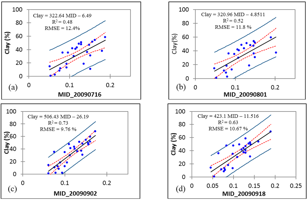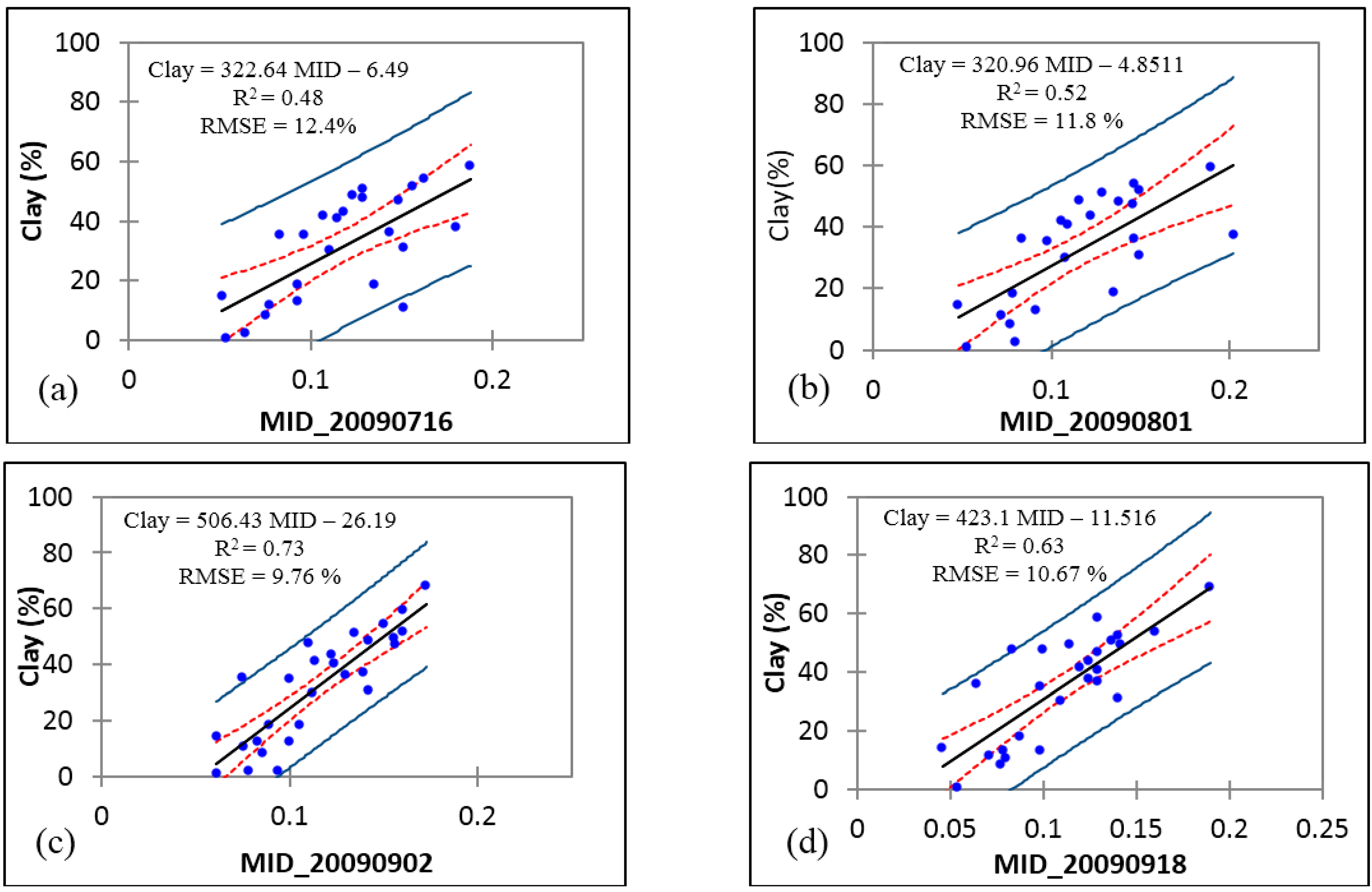 Linear relationship between MID-infrared index and observed clay content: (a) 16 July 2009; (b) 1 August 2009; (c) 2 September 2009; and (d) 18 September 2009. (Blue dots) observed clay content values. The red dotted line is the confidence interval of the mean. The blue line is the confidence interval for clay content observation. The continuous black line is the y-axis data versus x-axis data regression line.