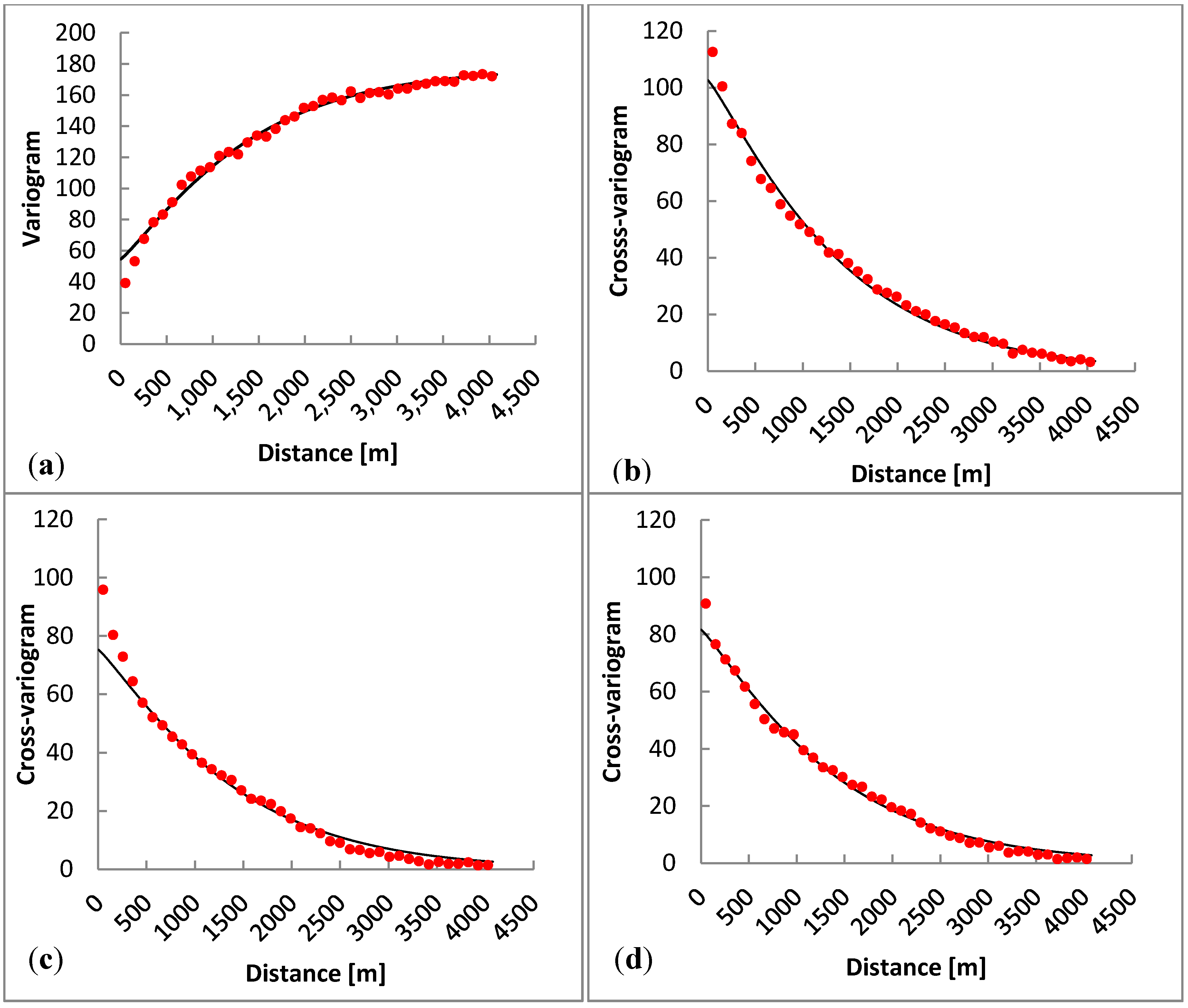 (a) Experimental semi-variograms (red dots) and model fits (black line) for topsoil clay content extracted from Landsat TM5 image acquired on 2 September 2009; (b) Cross-variogram between clay content from 2 September 2009 and 18 September 2009; (c) Cross-variogram between clay content from 2 September 2009 and 1 August 2009; (d) Cross-variogram between clay content from 2 September 2009 and 16 July 2009.