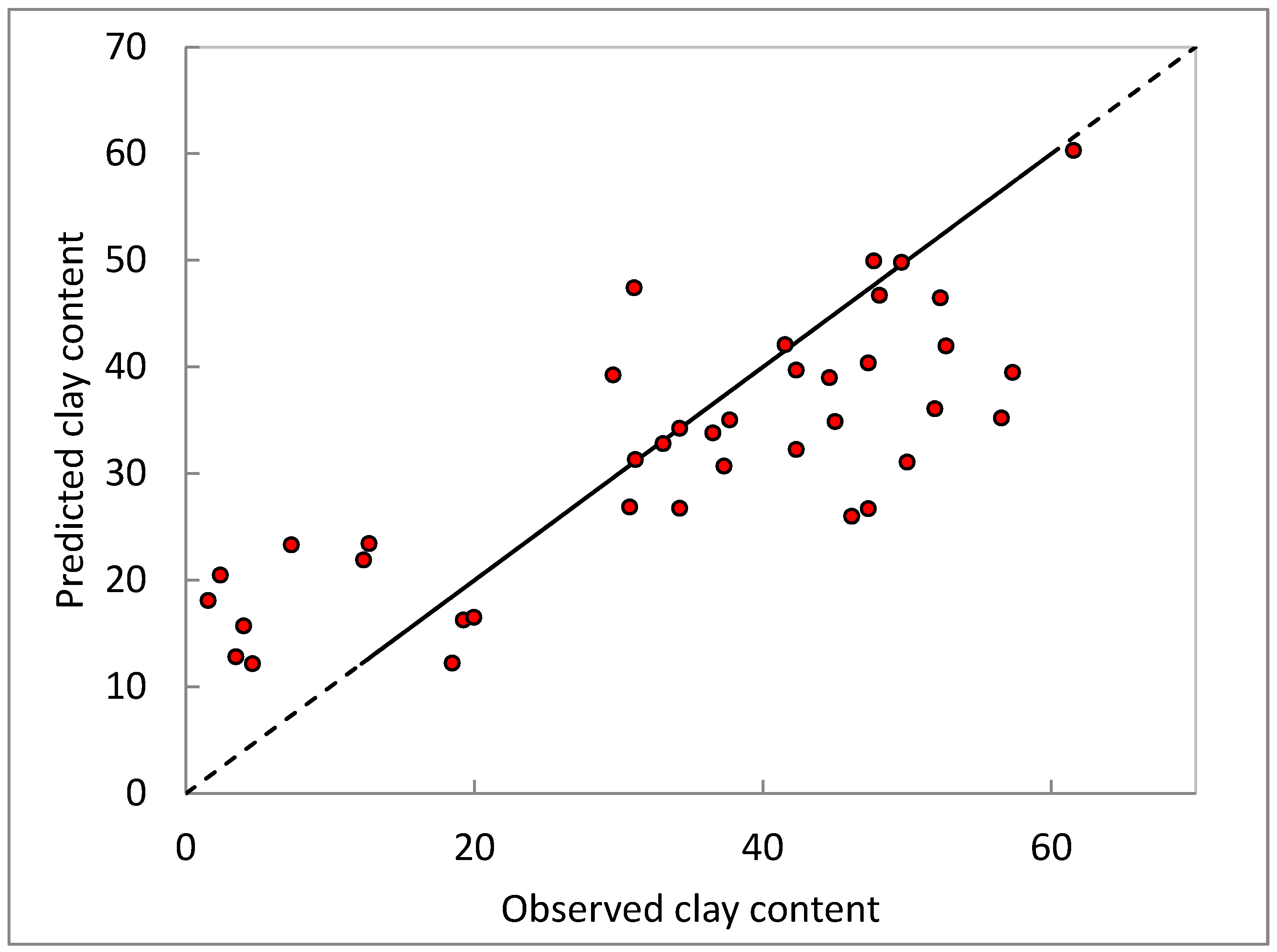The resulting clay content map was validated by comparison with 50 samples over the study area (Figure 1). RMSE is about 10%, corresponding to 100 g/kg of clay. The R2 between predicted and observed values is close to 0.65. Comparison between validation data set and clay content values predicted by cokriging is illustrated in Figure 8. The model used to predict topsoil clay content overestimates low observed clay content.