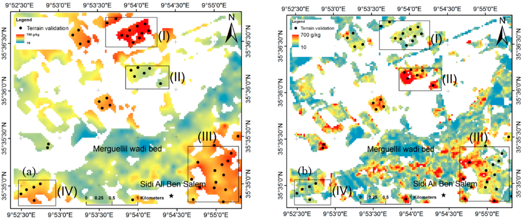 The accuracy of our clay content prediction model (R2 = 0.64 and a RMSE of about 10% corresponding to 100 g/kg) is in agreement with an existing study [12] who obtained an R2 = 0.6 and an RMSE about 12% (120g/kg). A comparison was therefore carried out with this study based on TerraSAR-X radar data on a smaller area (Figure 9a,b) where neither calibration nor validation points were present. Before comparing these two maps, the same mask of green vegetation is applied over the clay content map extracted from Landsat TM data. The clay map produced from TerraSAR-X radar data displays sharp contrasts over short distances compared to the smoother fields of Landsat TM. This is due to the effect of residual speckle. Cokriging and the rough resolution of Landsat TM lead to more continuous fields and therefore a smoother variation from one spatial element of similar texture to the other. Both maps show similar features such as the wadi bed of Merguellil with low clay content values. The other regions show similarities and differences in clay content values. Additional field observations were made without analysis to differentiate coarse and fine textural classes over some areas. Within region (I), we obtained high clay content value of about 60% when using Landsat TM data and low clay content value of about 15% using TerraSAR-X radar data. Field observation shows that the fields were not cultivated and this situation corresponds to bare soil areas with fine topsoil texture. Landsat TM, therefore, estimates clay content better than TerraSAR-X radar data within this area.