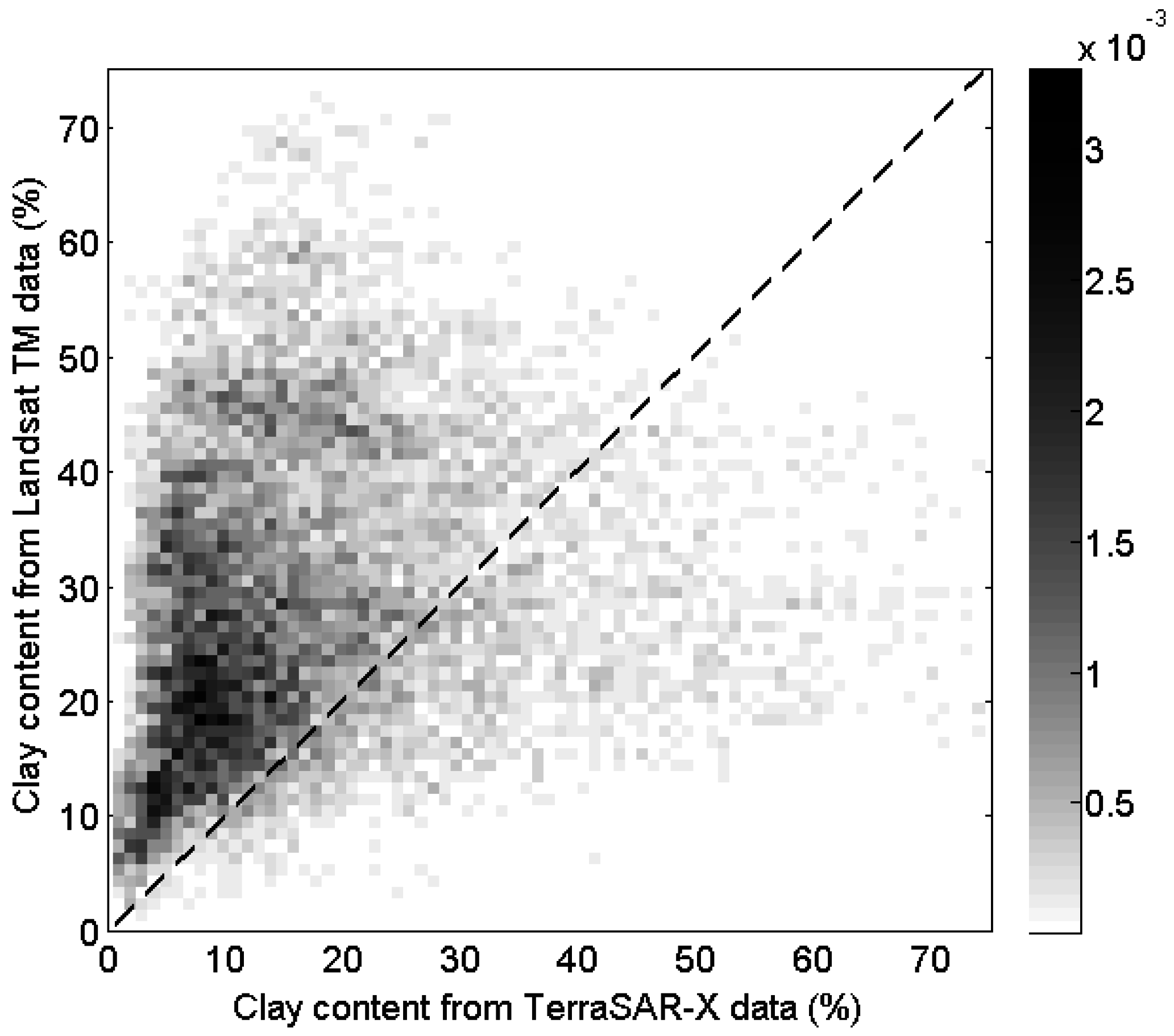Density plot of clay content obtained from Landsat TM data and clay content value from TerraSAR-X radar data. The dashed line is the 1:1 line.