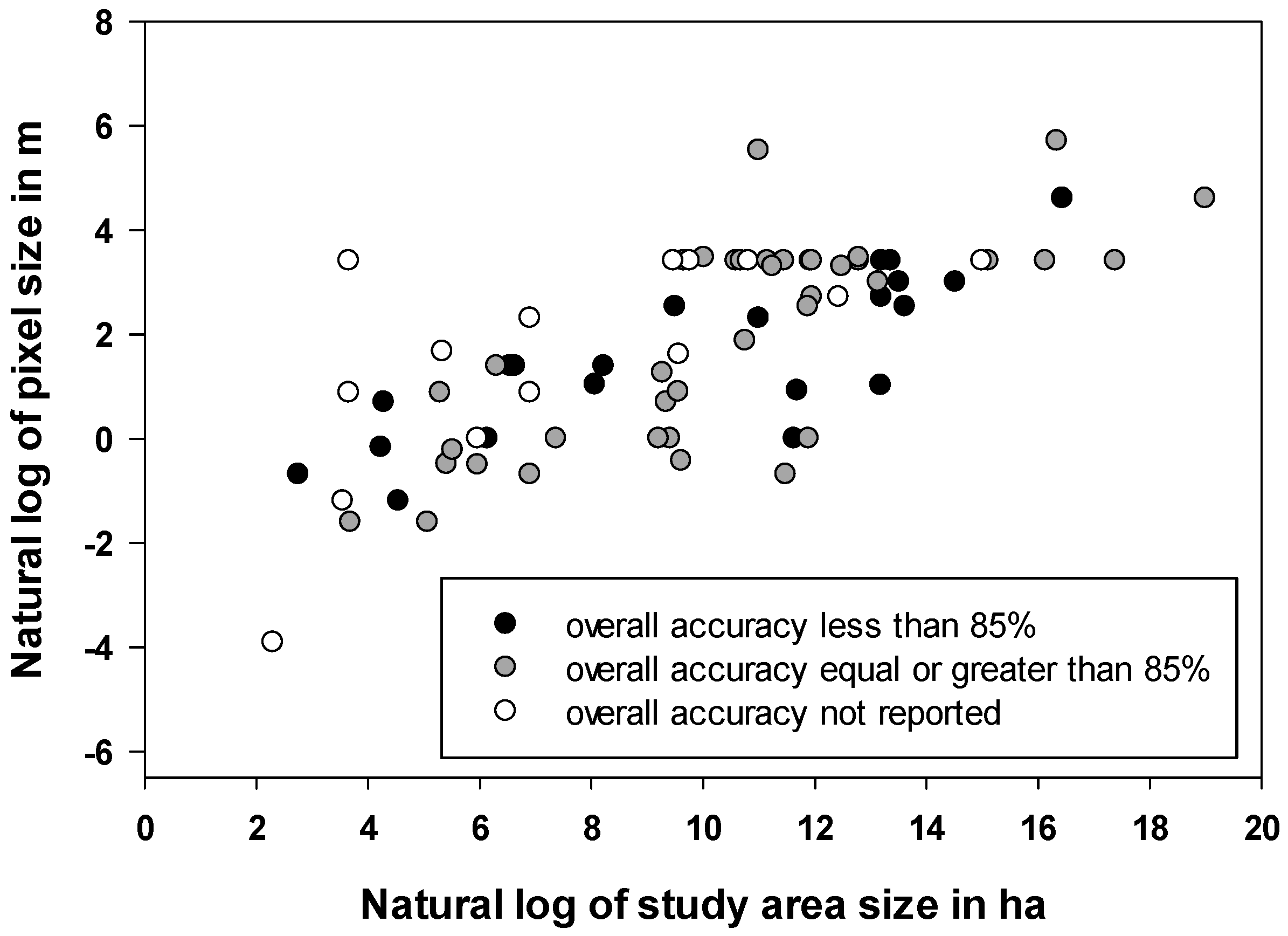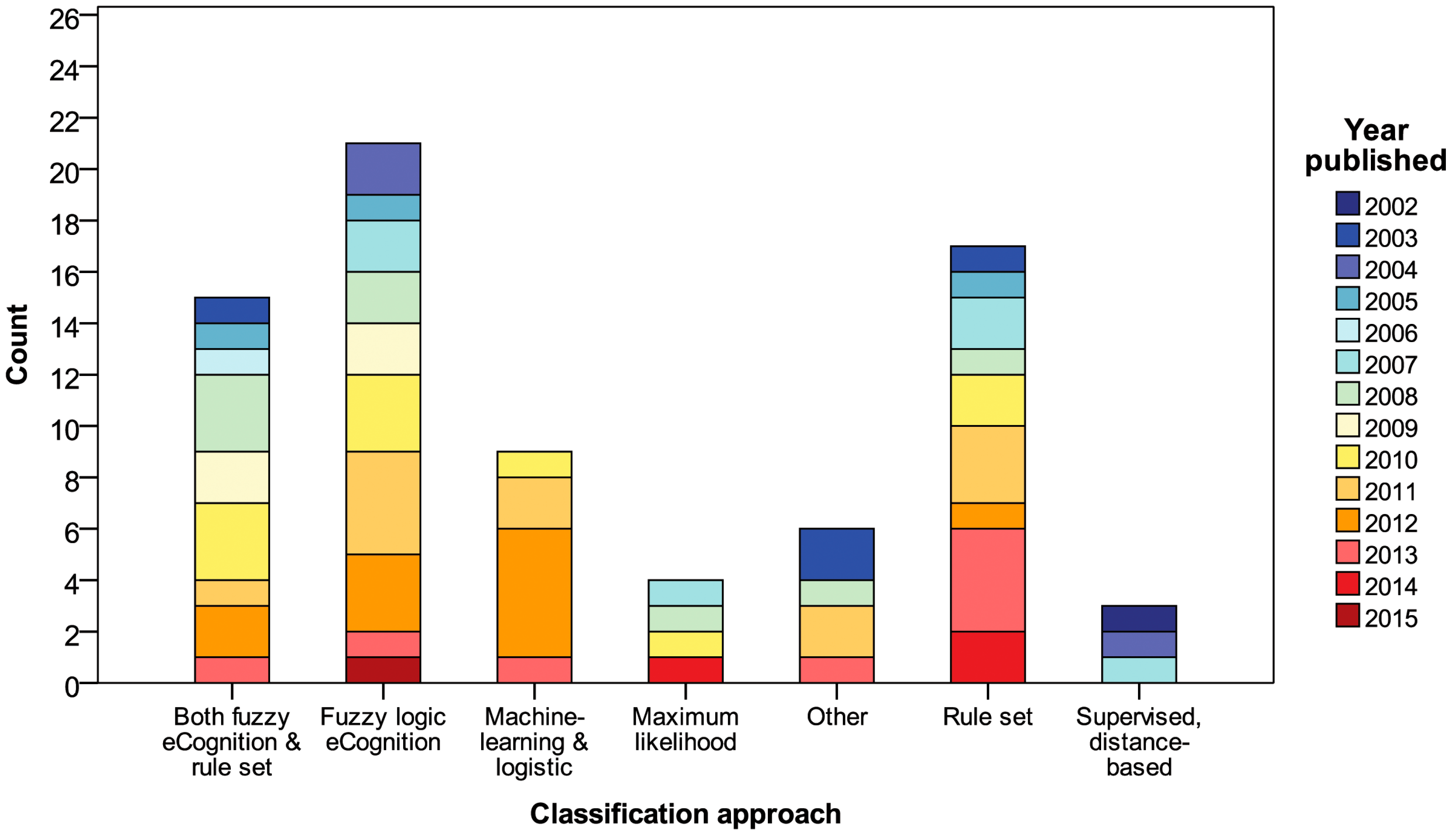 The choice of remote sensing data is critical in the OBIA success, and it typically depends both on the research objectives and on the availability of data of sufficient quality, appropriate spatial scale and affordable cost. The lack of the association between the highest overall accuracy and either spatial extent or image resolution (Figure 1) in the reviewed studies suggests that spatial scale was not a direct constraint on OBIA performance. Rather, it reflected differences in the spatial scope determined by study area size and pixel resolution, and the appropriateness of target classes given the latter. Ideally, image object dimensions should significantly exceed the scales of local noise and irrelevant (i.e., non-textural) heterogeneity [14,19,20]. With high-resolution data, this is possible through generation of objects that are relatively large compared to pixel size. With medium and coarse-resolution data, this task becomes less straightforward: while some of the local noise becomes “absorbed” at the pixel level, so do meaningful boundaries and textural properties of classes [17,43,88].