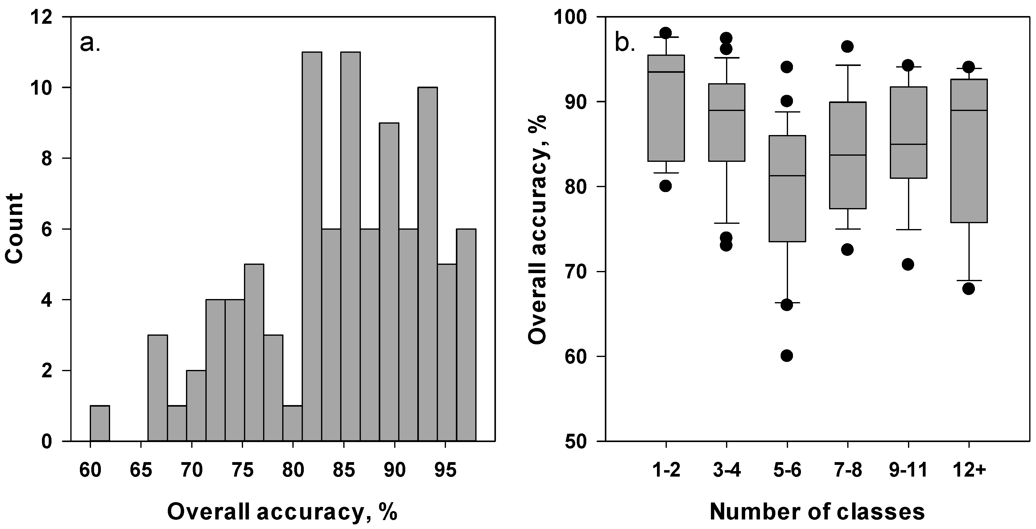 Among the reviewed studies, the overall classification or mapping accuracy was reported in 61 cases (Figure 1), and the distribution of the highest values per study or classification level was skewed to the left showing more values on the higher accuracy end, with the mean of 84.6% and the median of 85.9% (Figure 2a). No significant correlation was evident between the highest overall accuracy and either spatial resolution or spatial extent (p-value > 0.1) of the study area. Furthermore, the accuracy was not strongly associated with the number of target classes (Figure 2b), and values exceeding 90% were reported with both simple and more complex classification schemes. Generally, the occurrence of accuracies below the 85% benchmark increased after the number of classes exceeded 4; however, very few analyses used more than 10 to 11 classes. One study [8] tested discrimination of larger sets of wetland plant species with advanced machine-learning techniques and reported decline in accuracy from 98% with 10 classes to 89% with 40 classes. In addition, four studies compared object-based accuracy to pixel-based classification outcomes and reported the improvement of the overall accuracy by 1.5% [30], 7% [22], 28.8% [29] and 31% [24] with OBIA relative to the best pixel-based result. However, caution is needed for interpreting such accuracy comparisons, because studies vastly differed not only in their data and methods, but also in the quantity and characteristics of test samples. Furthermore, relatively common post-classification manual editing of OBIA results may increase the final map accuracy but reduce objectivity and clarity on method-specific performance and transferability [50].