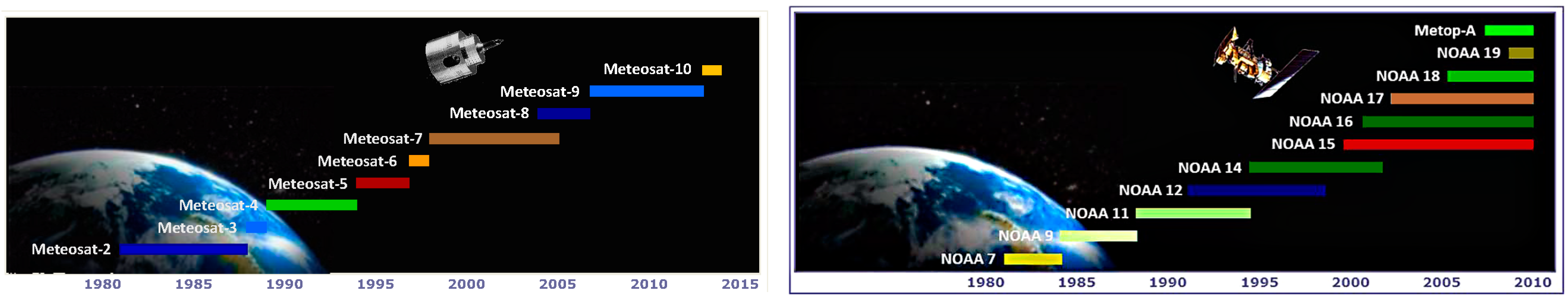 Right): CM SAF cLoud, Albedo and RAdiation dataset from AVHRR data—edition 1 (CLARA-A1) temporal coverage by National Oceanic and Atmospheric Administration (NOAA) satellite number. Right panel figure with permission from [