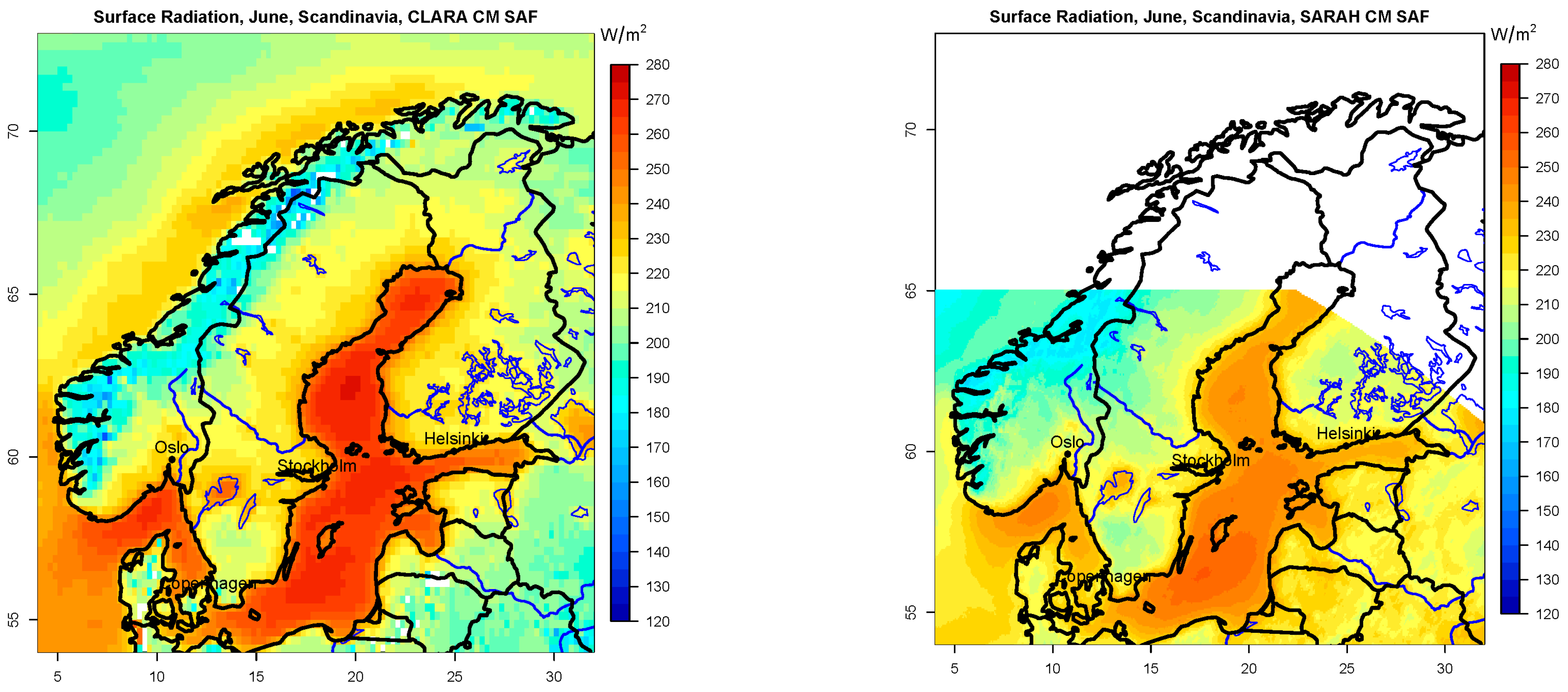 As an example, the overall mean SSR in June from both CLARA and SARAH datasets over Scandinavia is shown in