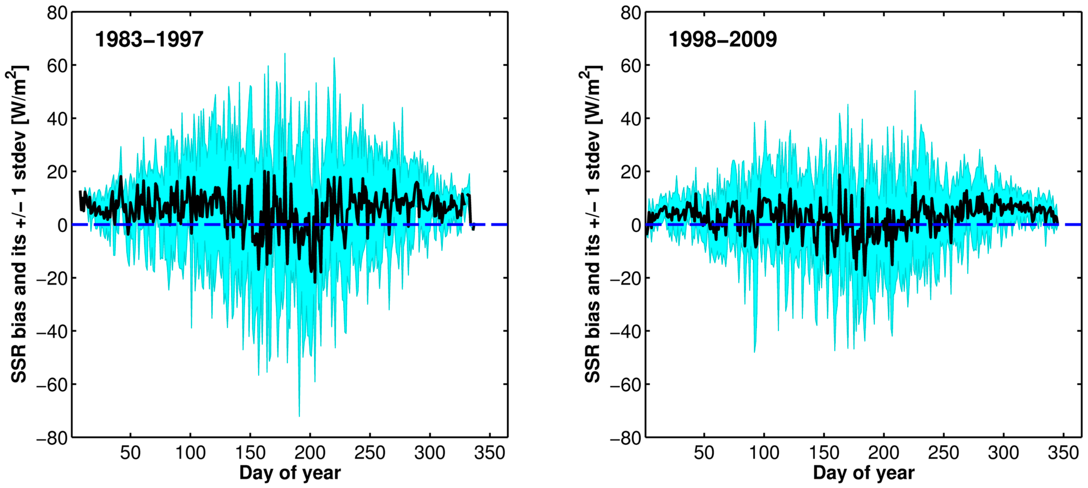 However, a more complete comparison of SSR trends from satellite datasets remains a topic for a more rigorous investigation. As discussed before, differences in the treatment of aerosol effects on SSR and applied aerosol climatologies may vary substantially between datasets, with potentially significant impacts on the retrieved SSR. On the other hand, even modest differences in the detection and treatment of cloudiness can also have a substantial impact on the retrieved SSR.